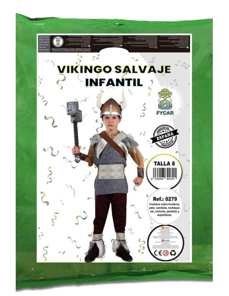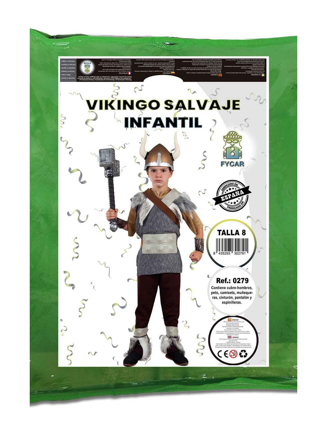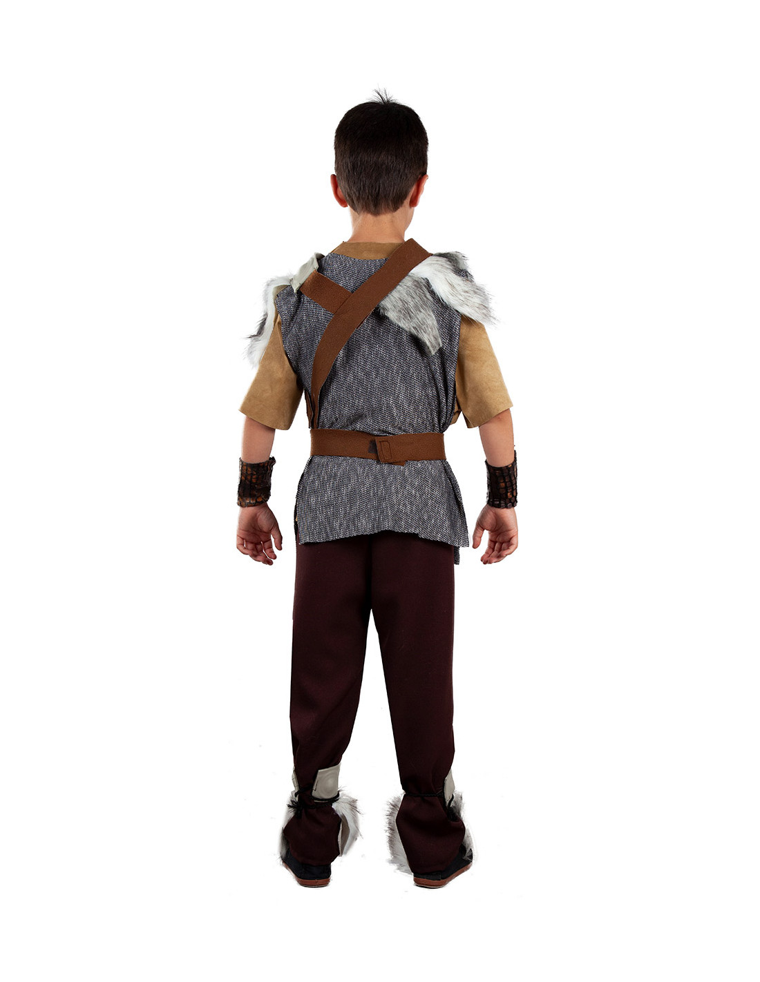 El disfraz vikingo niño contiene cubre-hombros de pelo gris, peto gris sin mangas, camiseta manga corta marrón, muñequeras, cinturón con pieza de goma eva, pantalón y espinilleras con pelo, piezas de goma eva y cordón para ajustar.