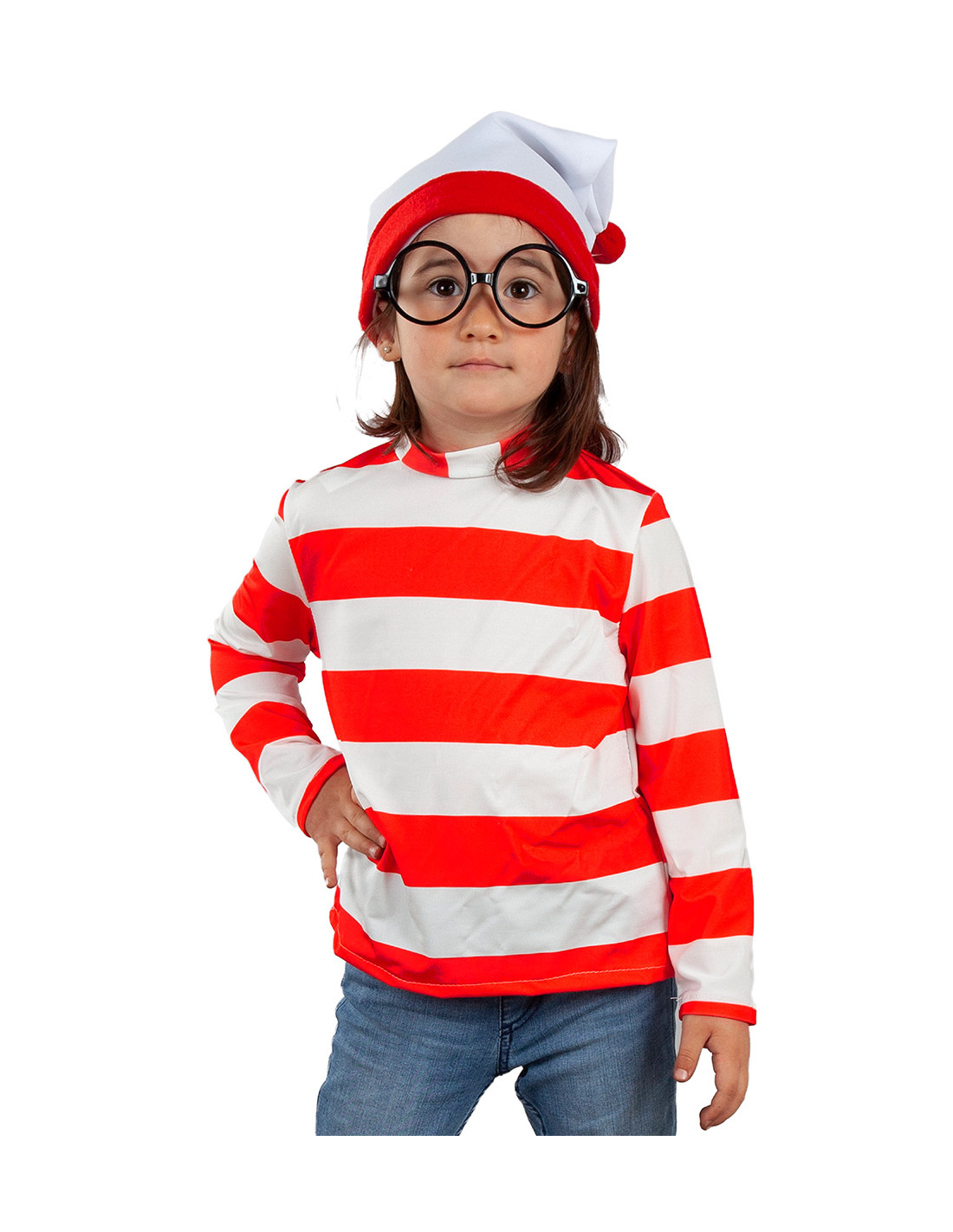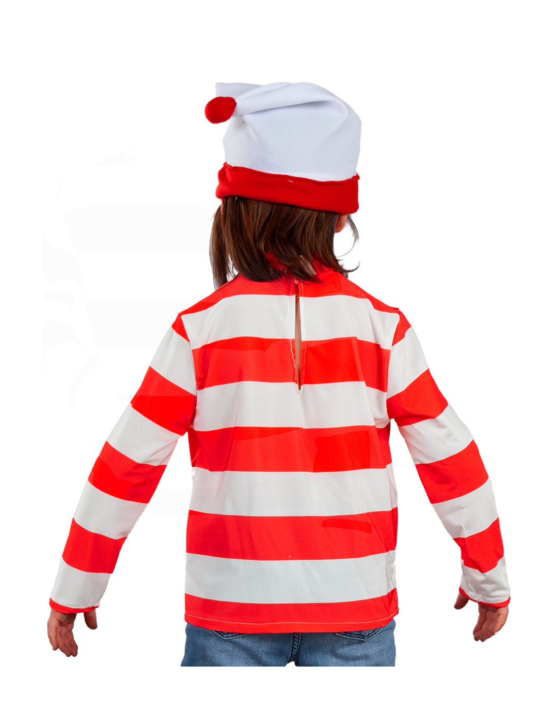 El disfraz Wally para bebé contiene una camiseta de manga larga con rayas rojas y blancas y un gorro con los mimos colores.