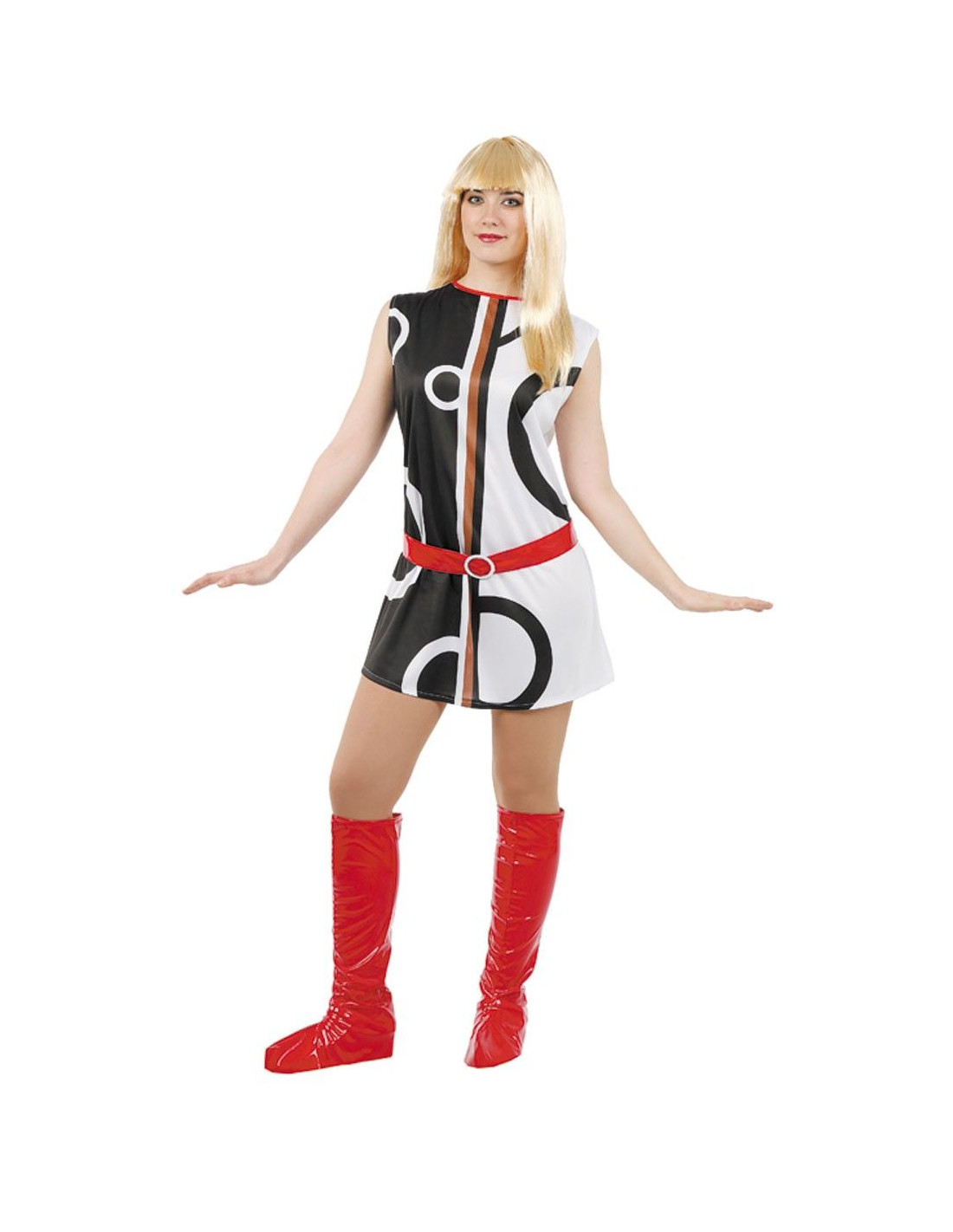 Disfraz yeye disco años 60, que incluye: Vestido estampado con formas asimetricas negro y blanco y cinturon rojo.