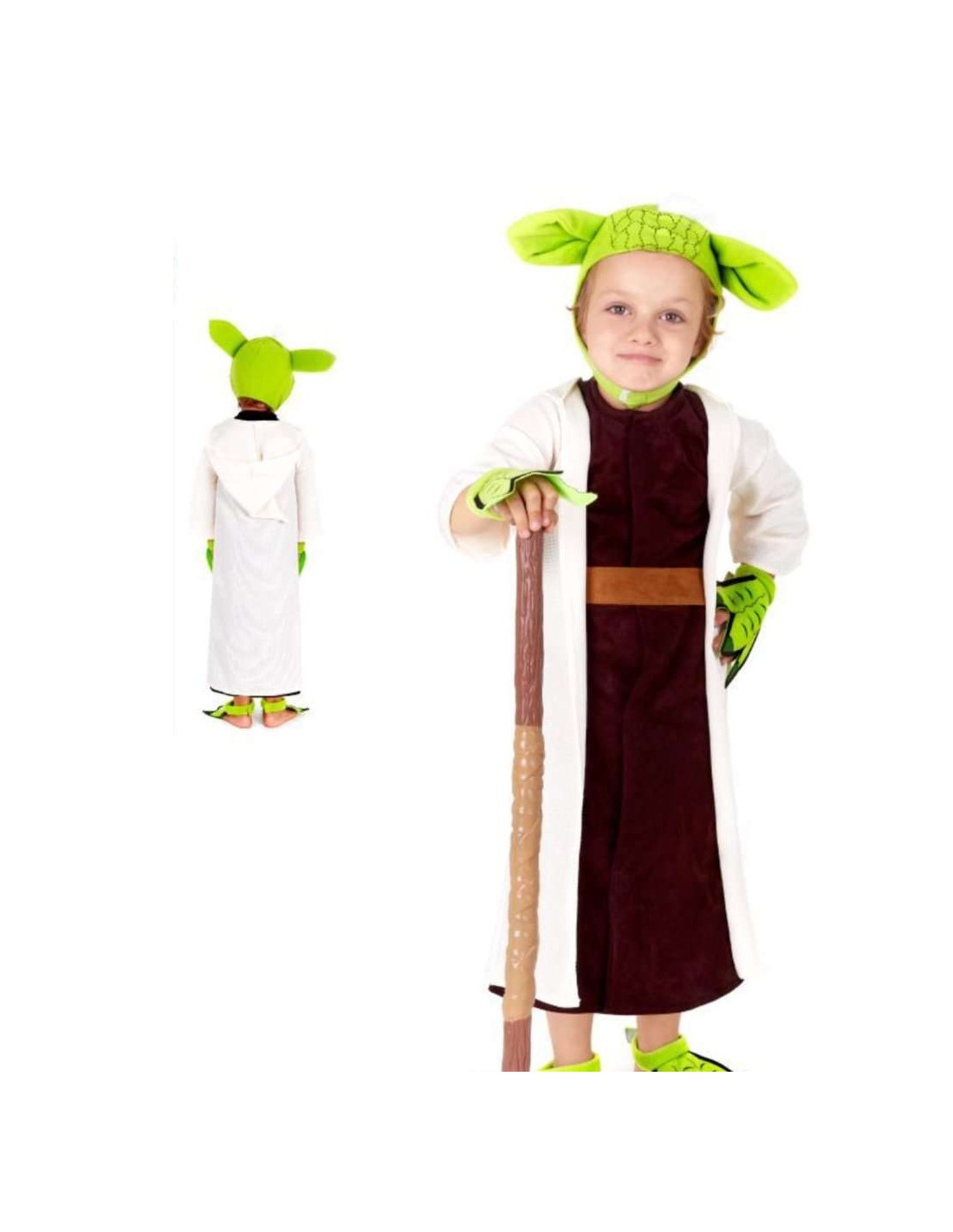 Disfraz Yoda infantil que incluye: túnica, chaqueta, cubre pies, cubre manos, cinturón y gorro.