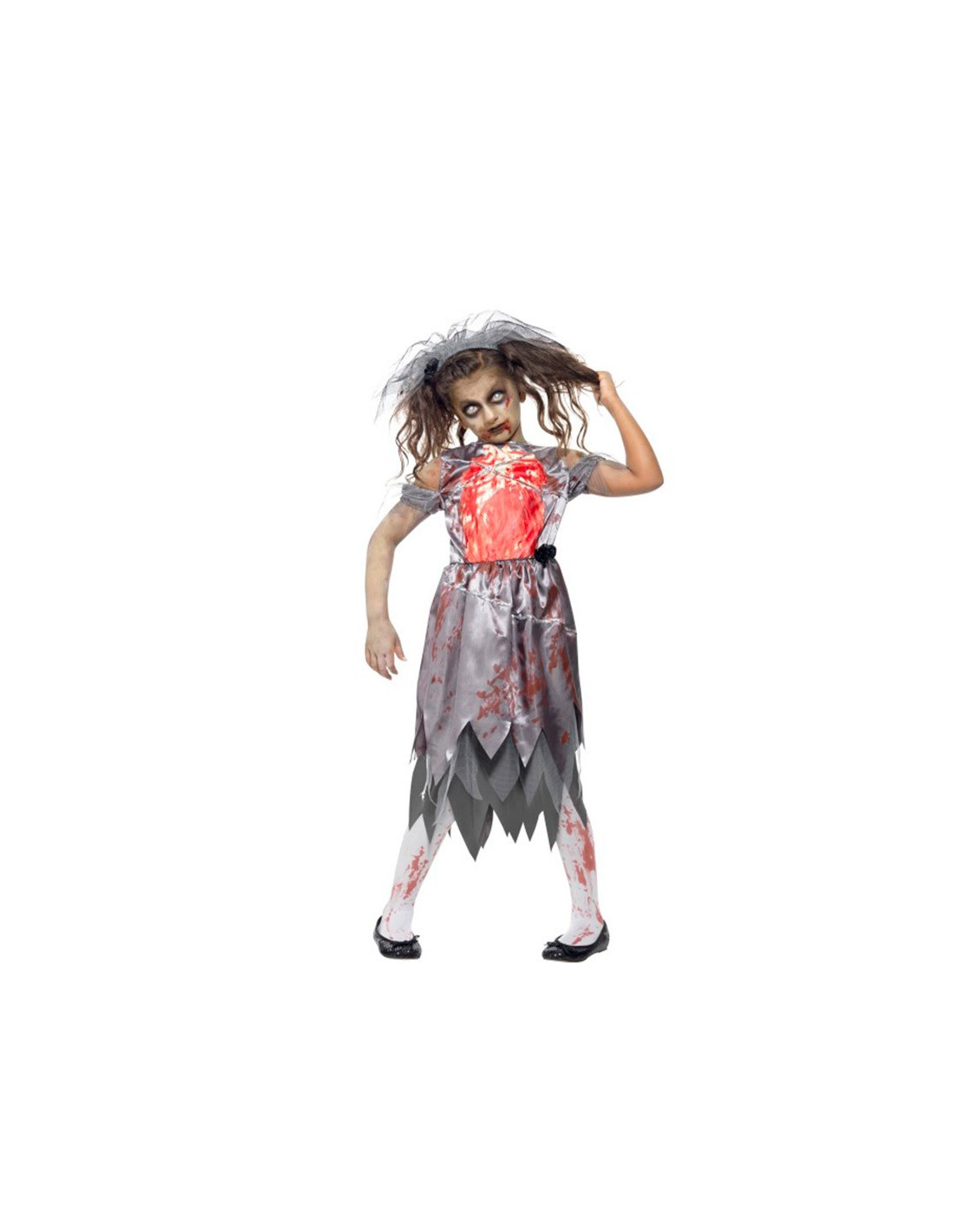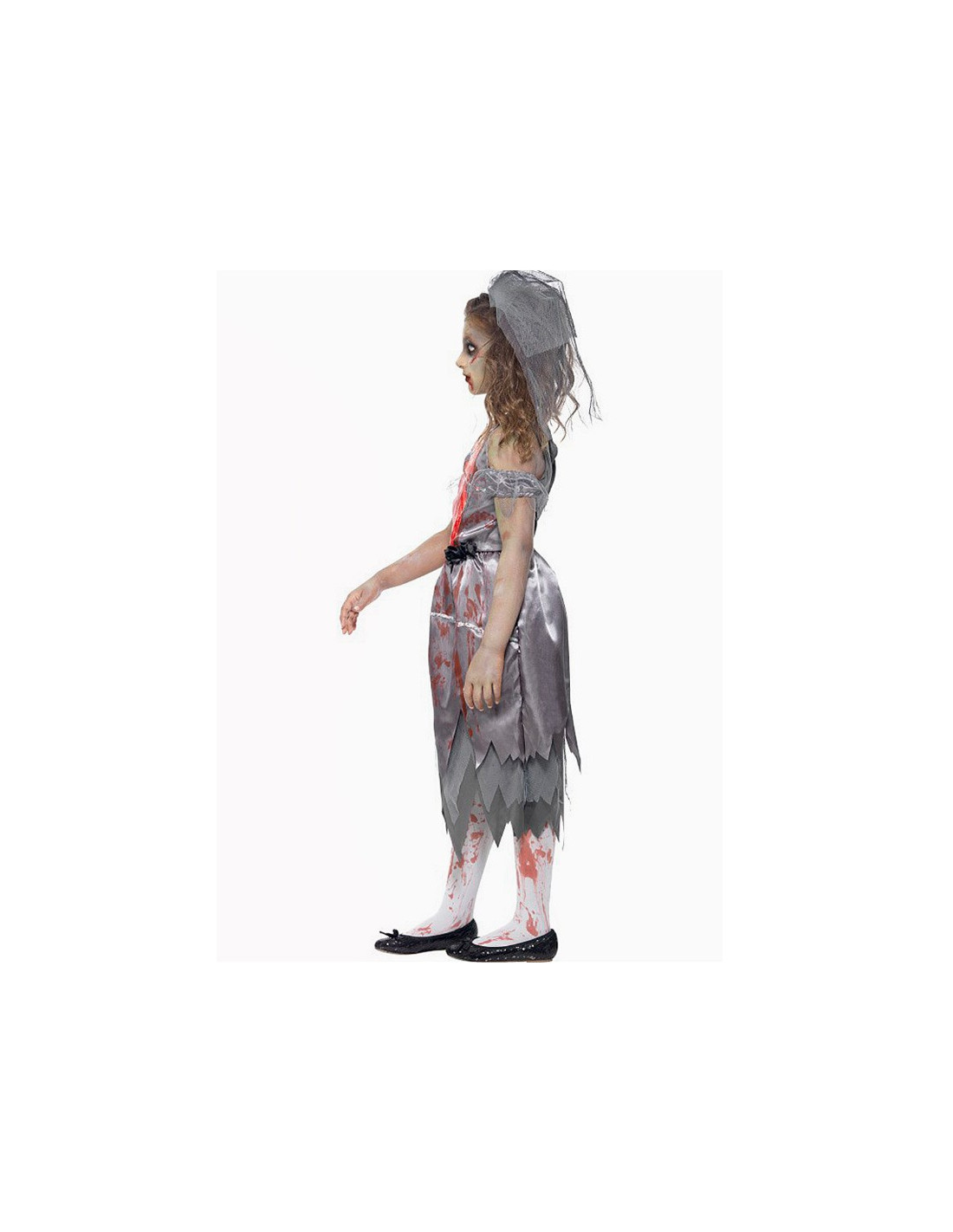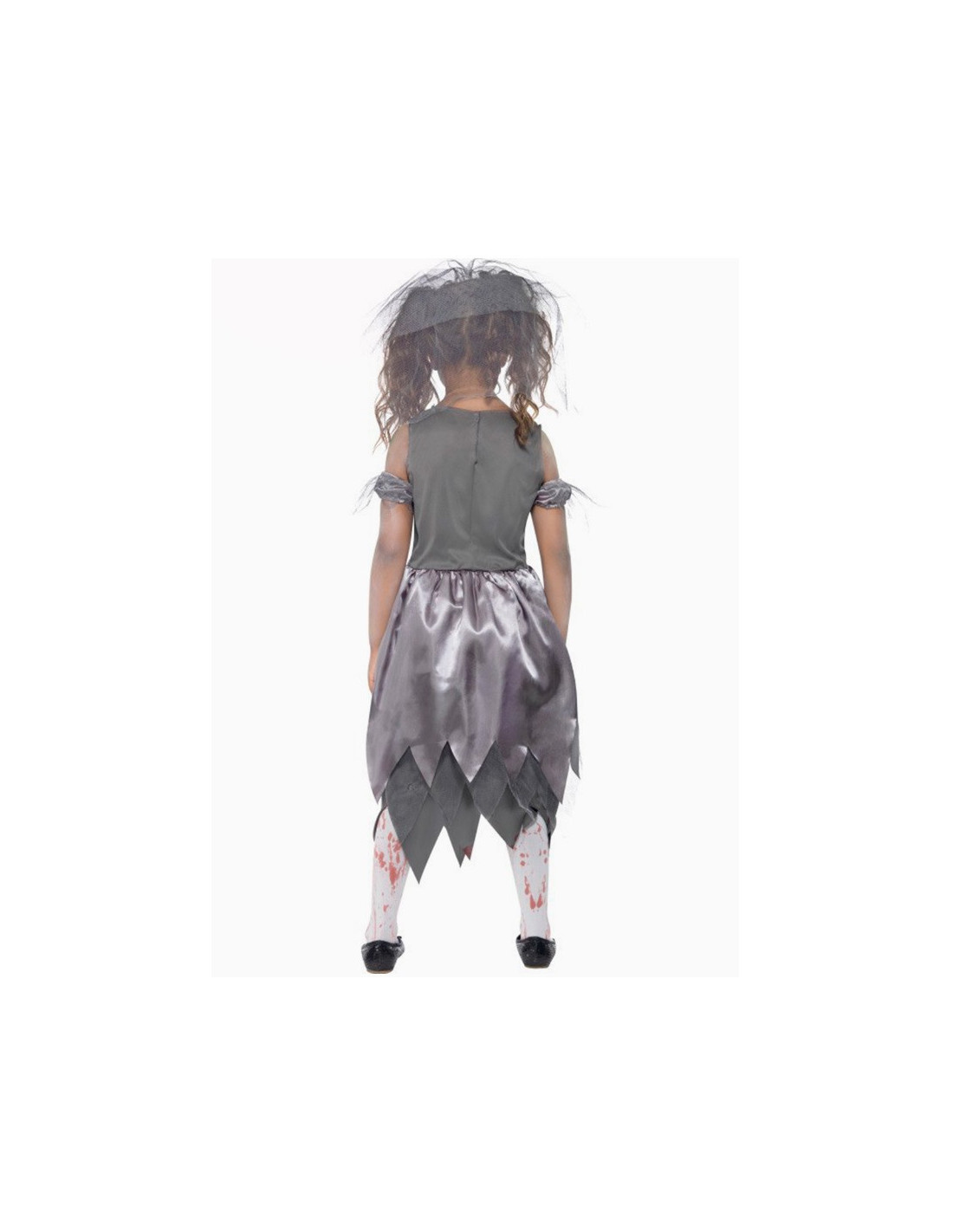 Disfraz zombie novia para niña que contiene un vestido gris con sangre impresa en el pecho y velo. No contiene calzado, medias ni maquillaje.
