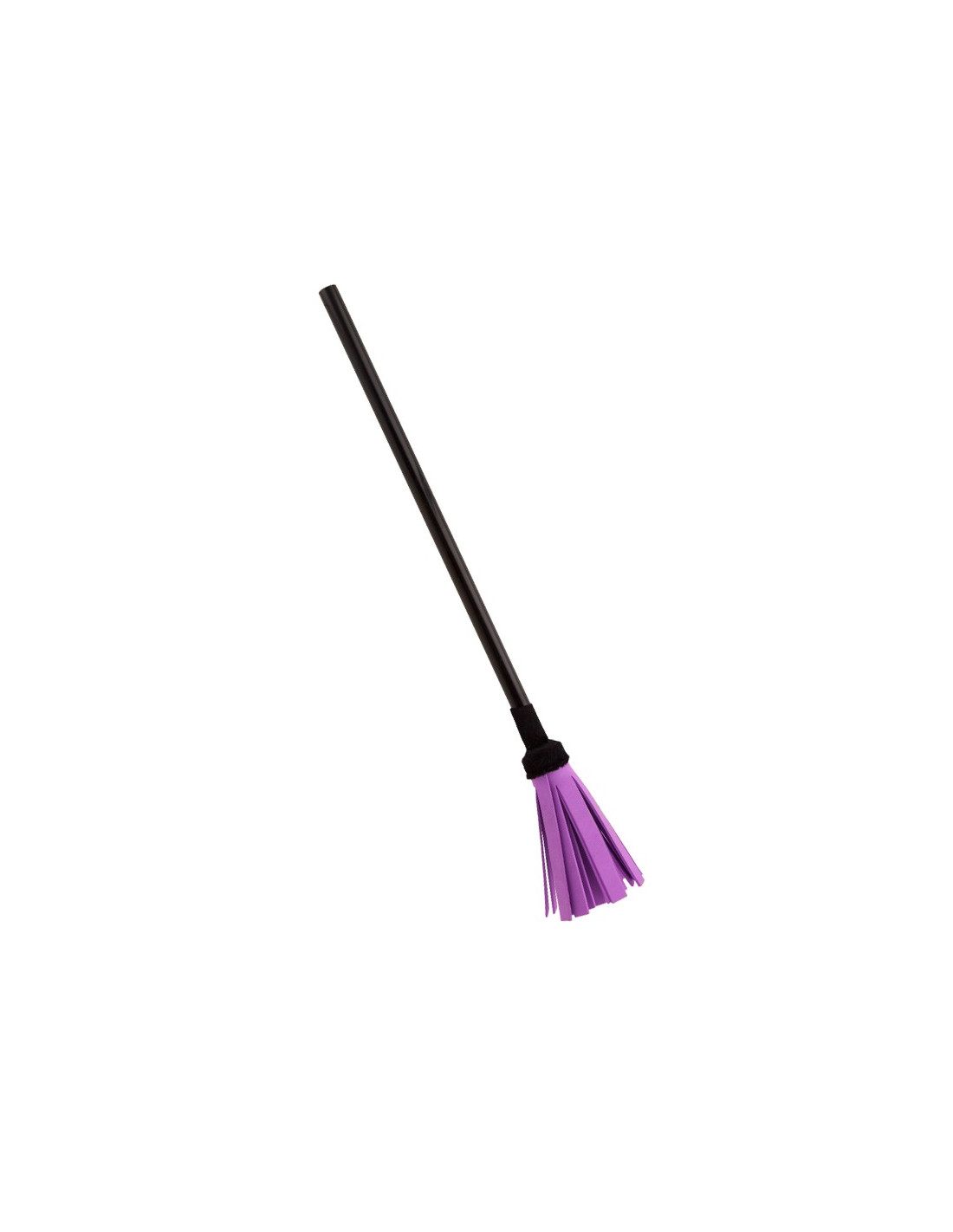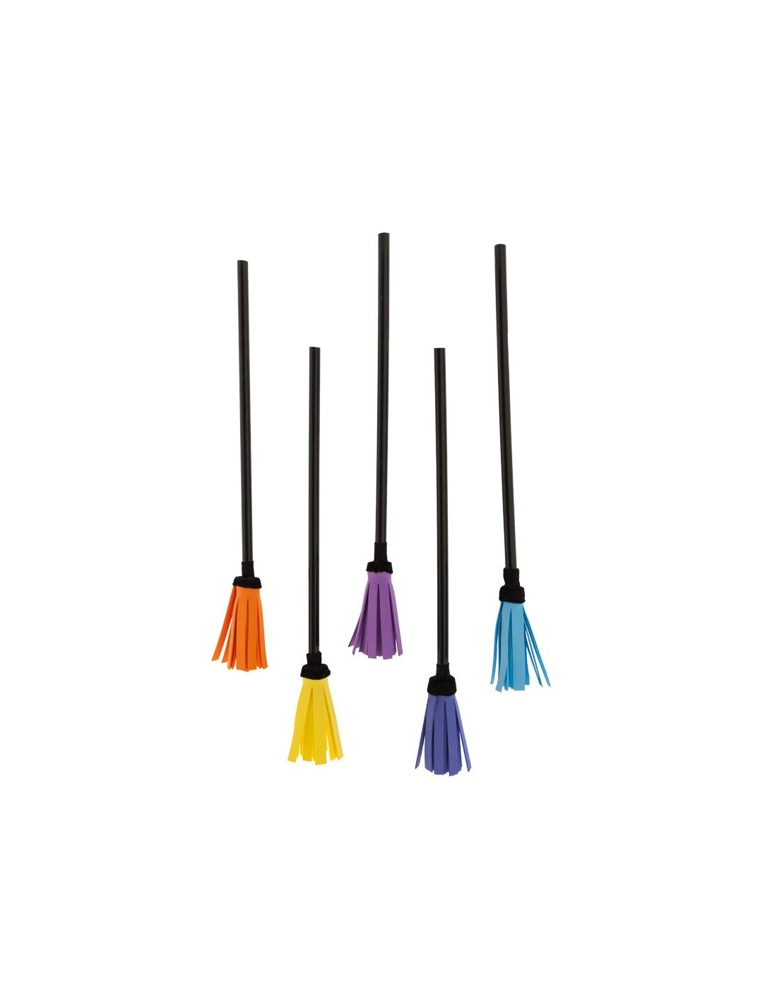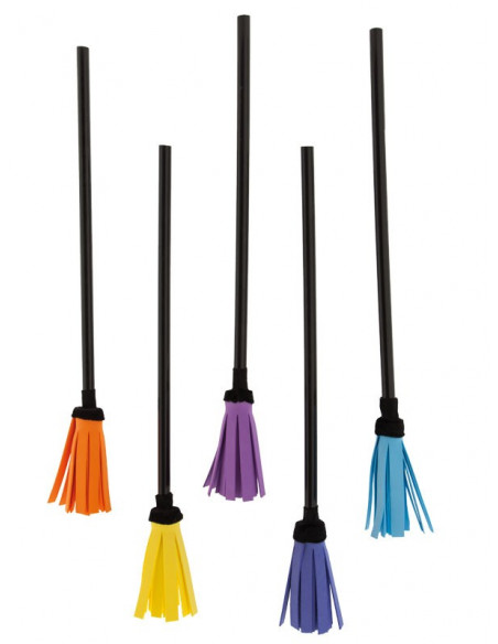 Escoba de bruja pequeña que incluye una escoba de 62cm de altura con mango de plástico y cabezal de goma eva en colores surtidos.