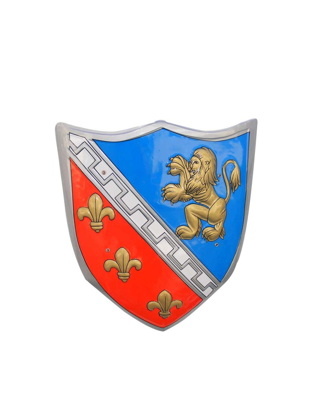 Escudo medieval de caballero para tu traje de la Edad Media. Fabricado en plástico de pvc, con la forma de un escudo suizo y en una mezcla de colores rojo, azul y plata, presenta unas figuras en relieve de un león y flores sobre la parte anterior. Dimensiones de 47 x 59cm. Incluye dos abrazaderas en la parte posterior para sujetarlo a la perfección.