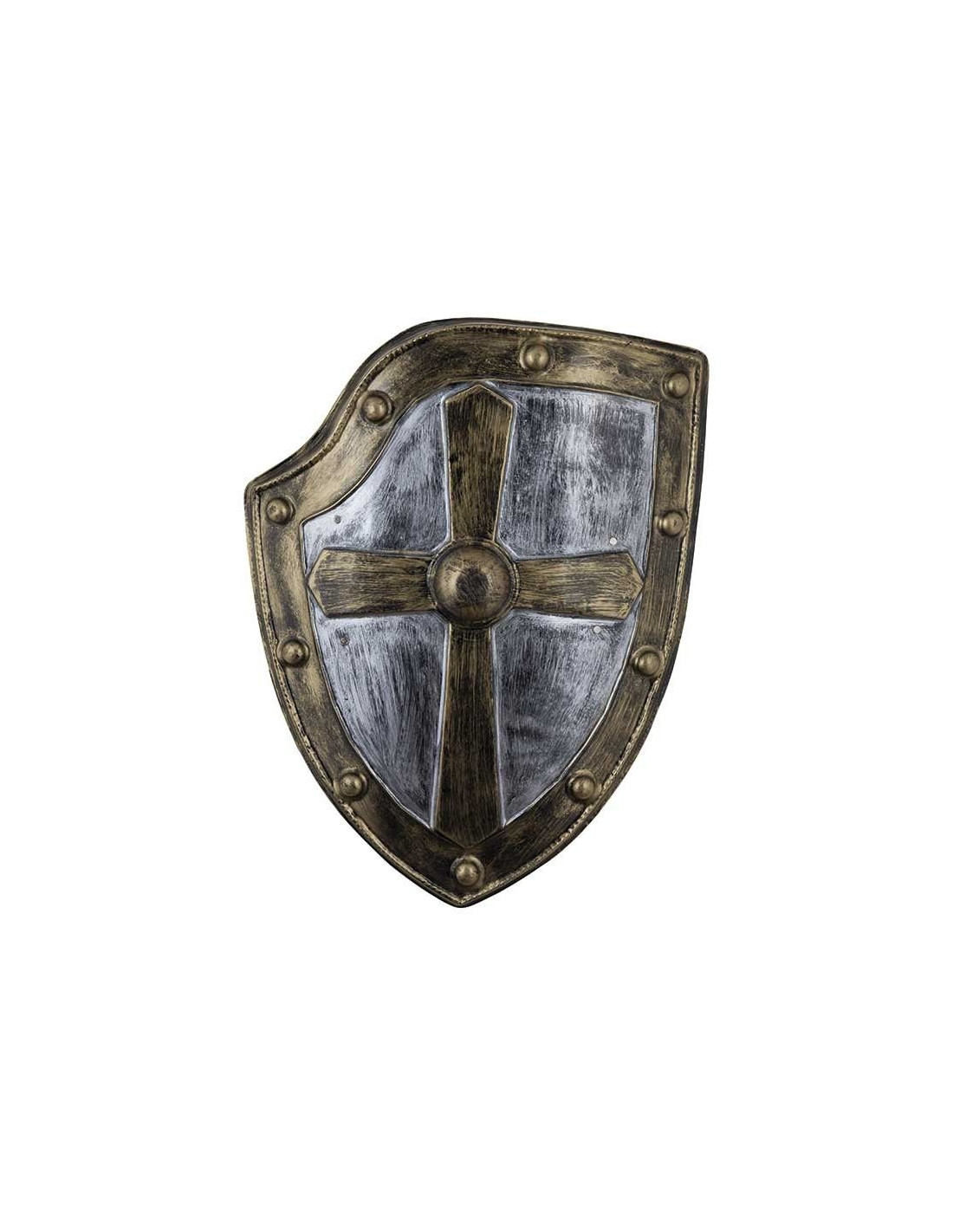 Escudo medieval con una cruz en la parte central delantera. Fabricado en plástico de pvc, tiene los bordes y la cruz en color bronce envejecido y el fondo en plateado. Dimensiones de 62x48cm.