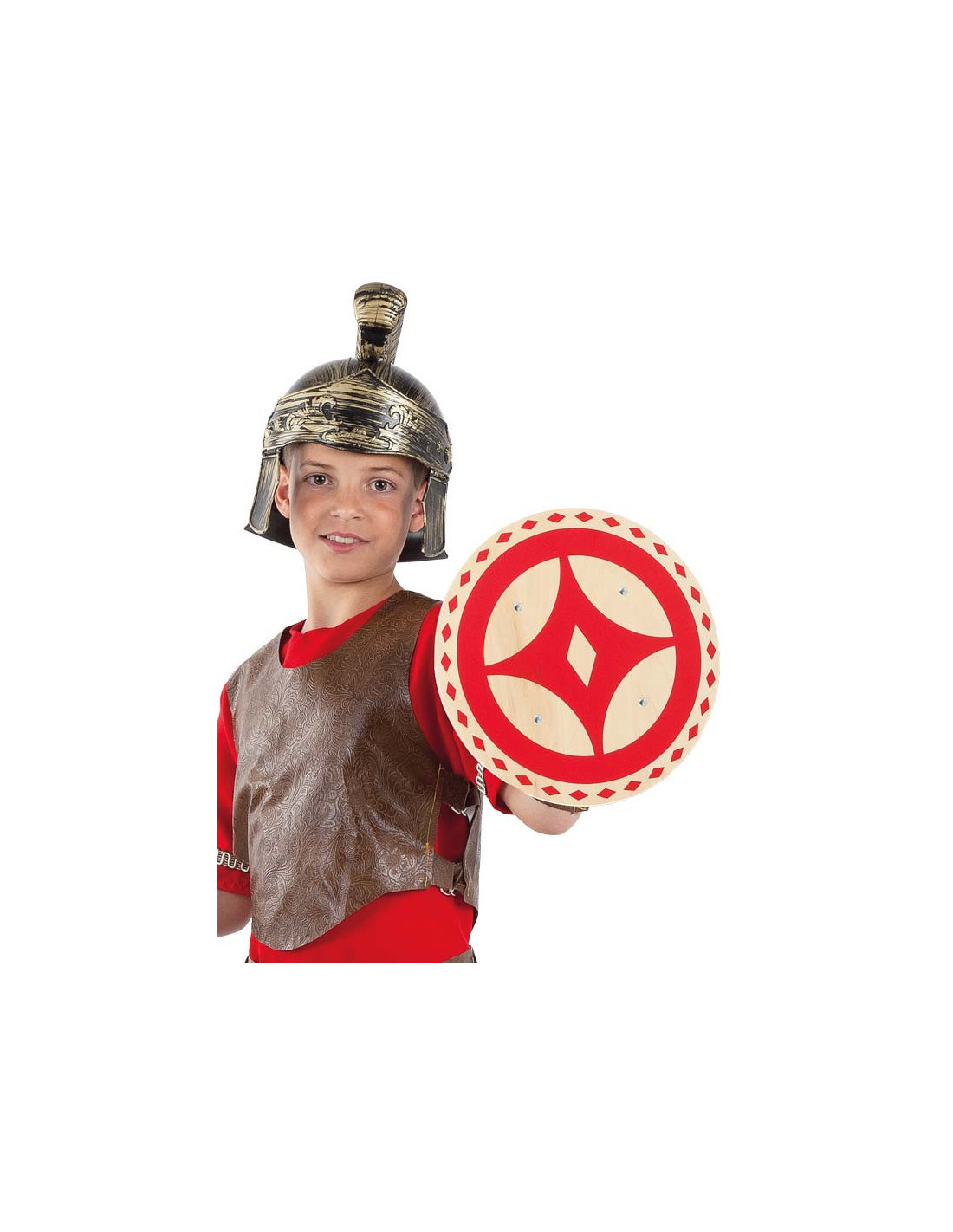 Complementa tu disfraz de soldado romano cone este escudo romano de madera. Dimensiones de 29cm de diámetro. Disponible en colores surtidos.