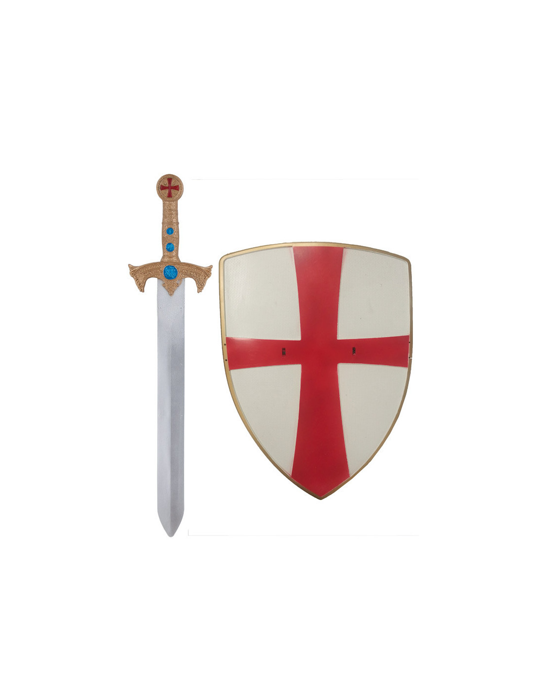 Kit de escudo y espada medieval de plástico de pvc. Ideal para caballeros templarios, pues la espada lleva la cruz patada en color rojo sobre la empuñadura mientras que en el escudo la lleva en la parte central, en color plata sobre un fondo negro. on la cruz templaria como símbolo de ambos Dimensiones de 58x14cm y 31x41cm respectivamente.