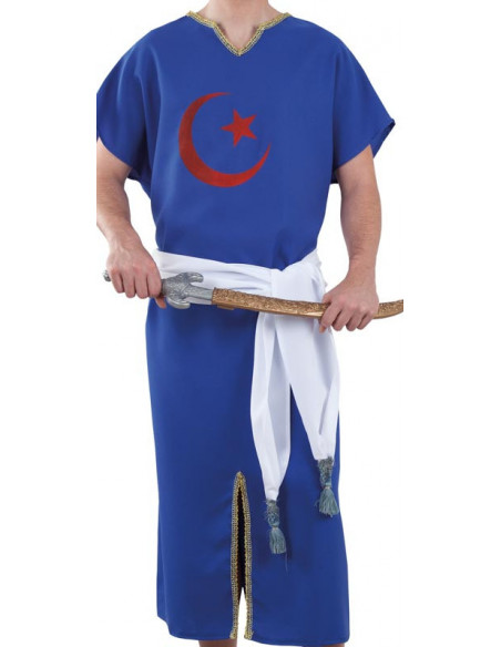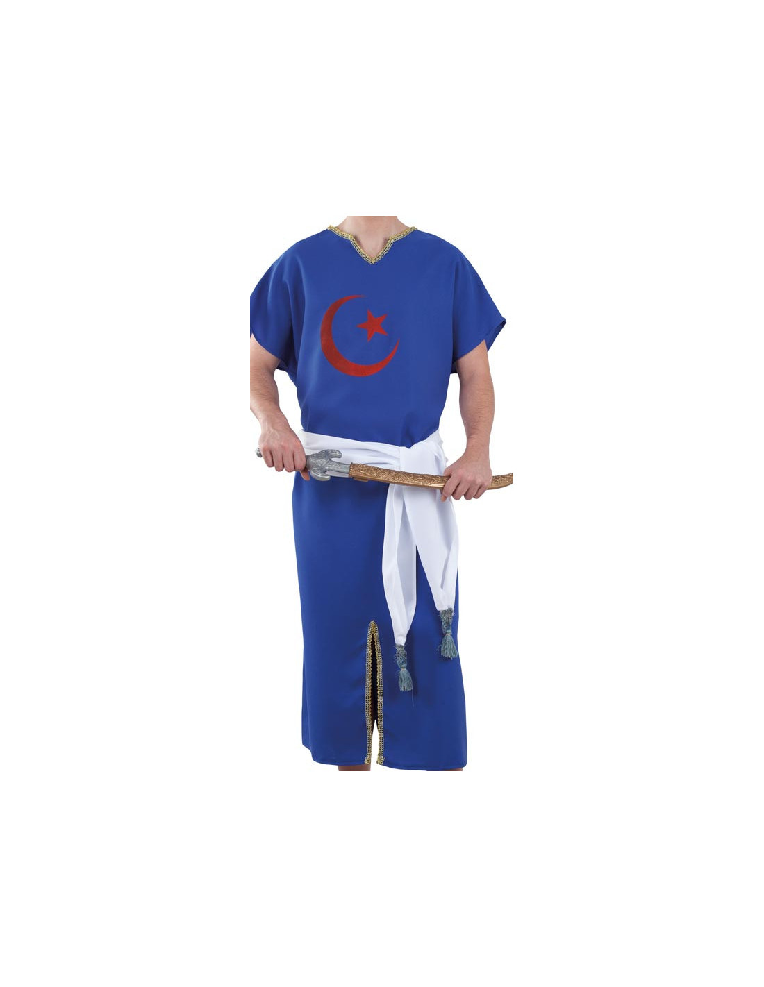 Complementa tu disfraz de simbdad el marino con esta espada árabe. Fabricada en plástico. Incluye espada árabe y funda de plástico en color oro. Dimensiones de 58 cm de largo.