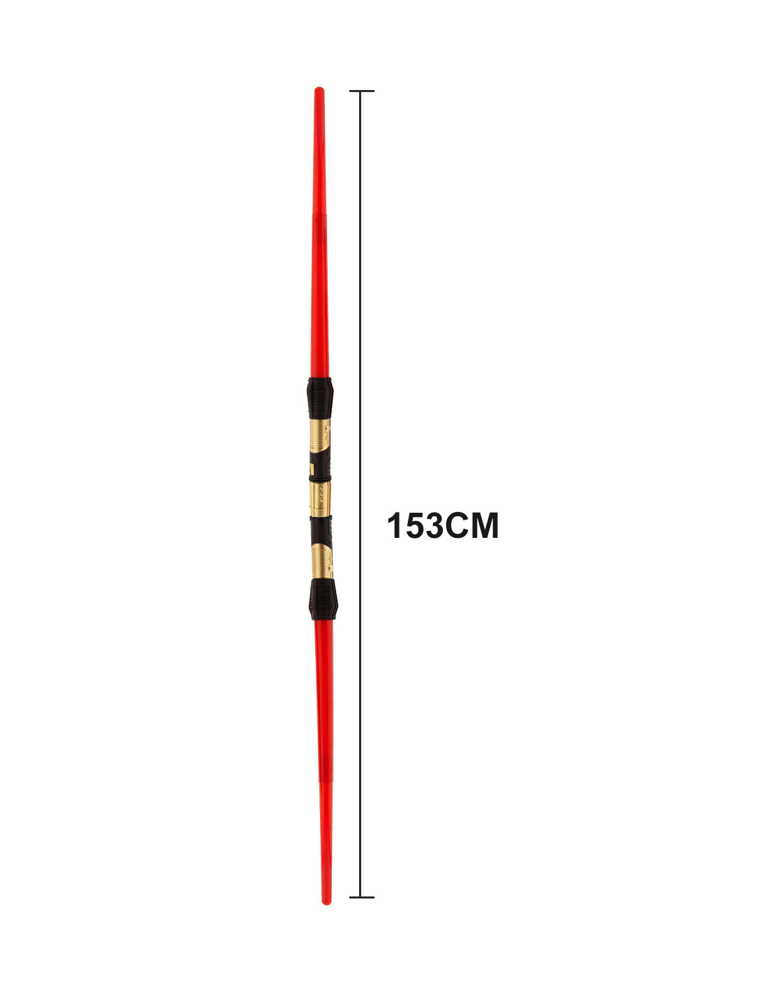 Es una espada doble de plástico que mide 153cm de largo totalmente estirada y que tiene luz y sonido. Viene desmontada por la mitad en dos piezas. Funciona con dos pilas AAA que no vienen incluidas.