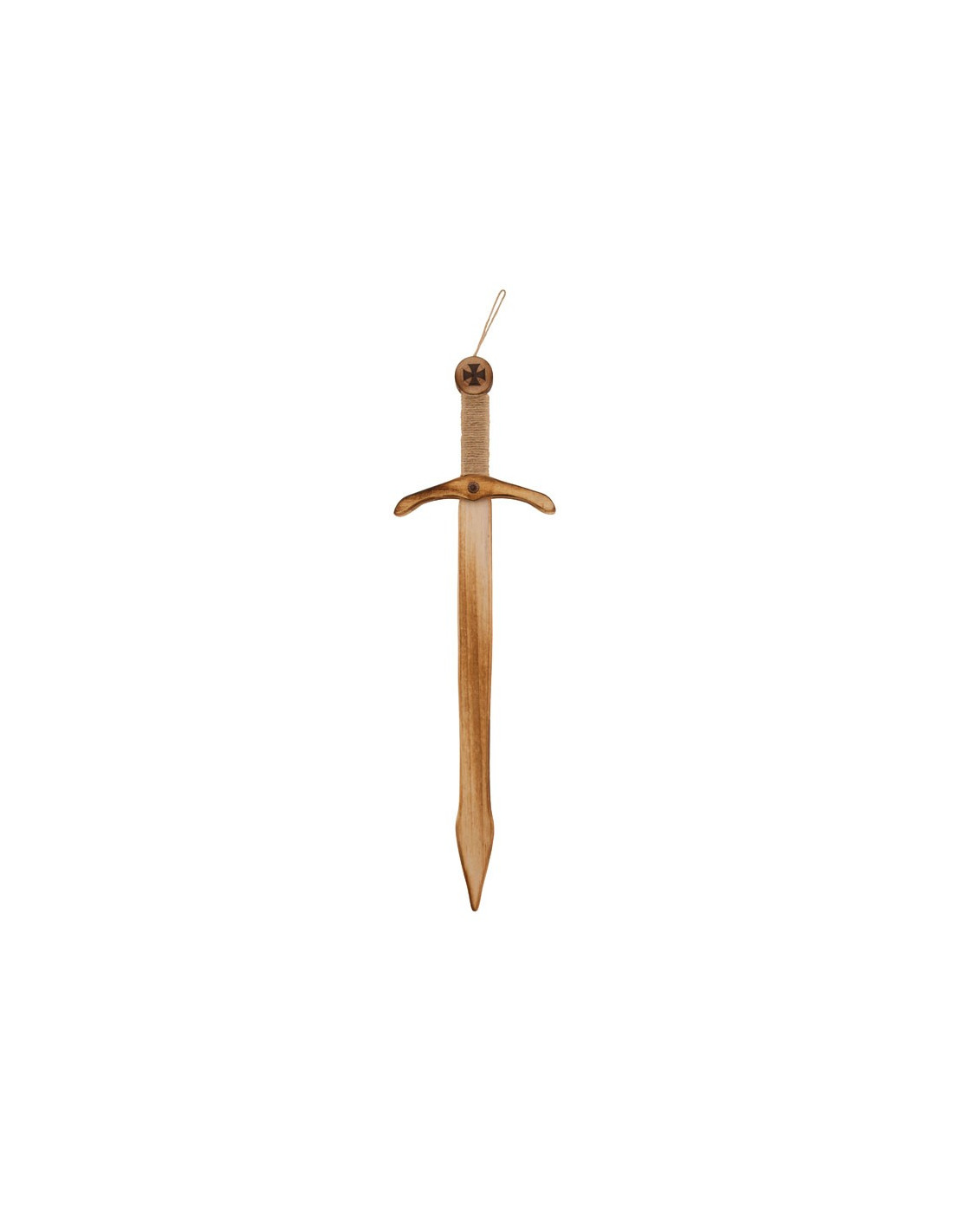 La espada mide 55cm de alto. El mango está forrado con cuerda y una cruz grabada.