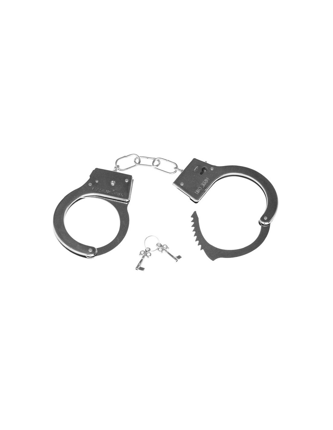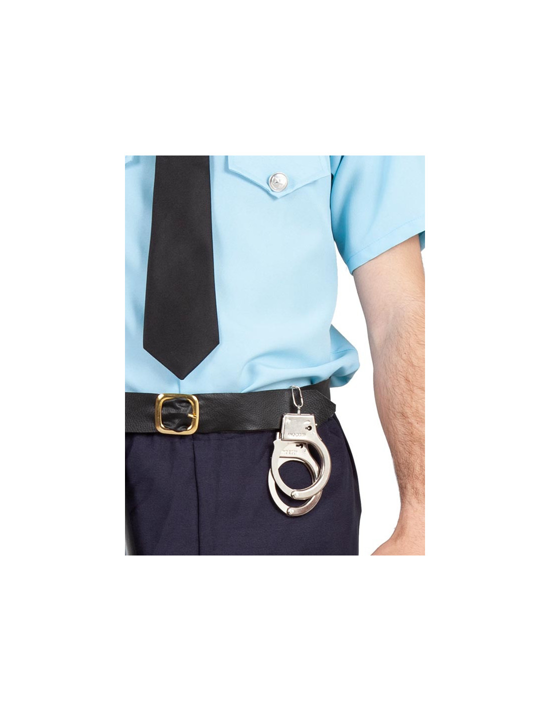 Esposas para disfraz de policía, de plástico efecto metal. Los grilletes están unidos con una cadena, e incluyen un sistema de apertura y unas llaves de simulación.