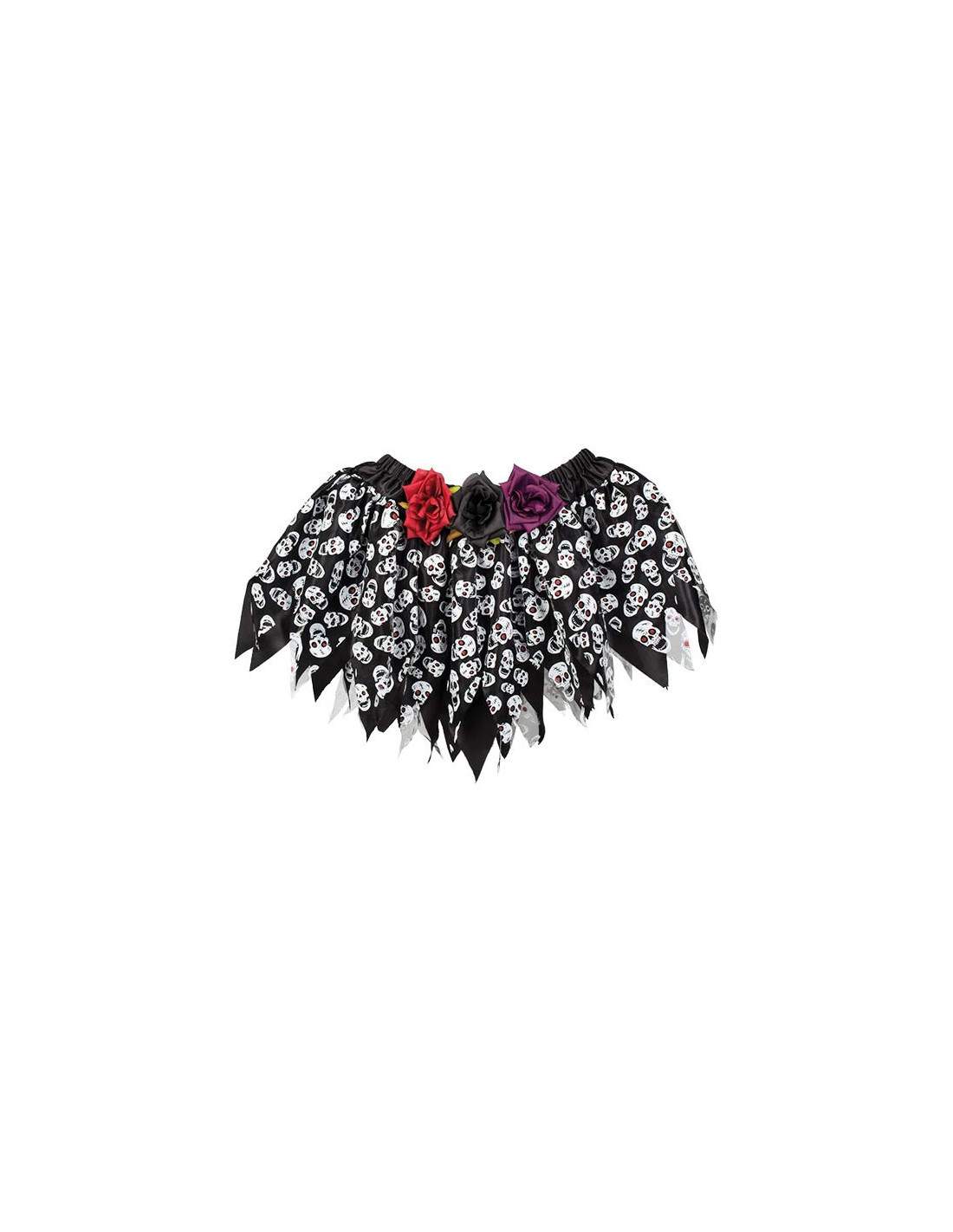 Esta falda Catrina tiene un estampado de calaveras. La falda tiene la cintura elástica con tres flores sintéticas y acabada en picos.