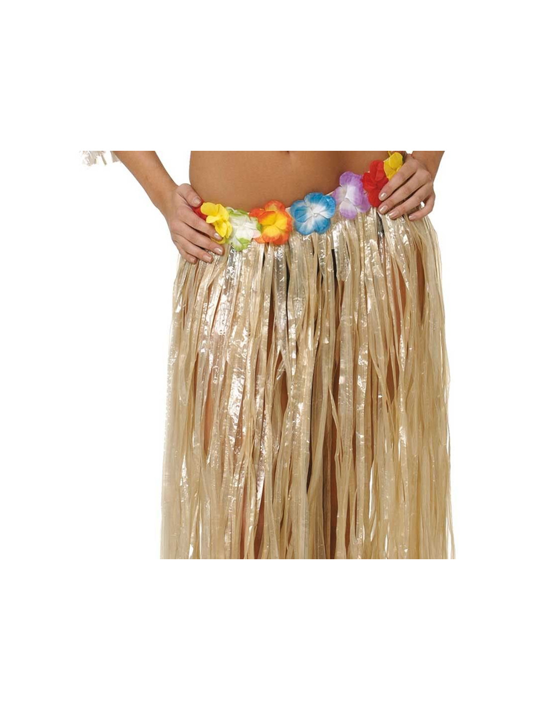 Complementa tu disfraz de hawaiana para bailar el hula como lo hacen los verdaderos nativos con esta falda hawaiana corta. Incluye una fantástica falda hawaiana corta fabricada en rafia sintética, con adornos decorativos florales en la parte superior, elástico y velcro para ajustar a la cintura, y de 60cm de largura y 90cm de cintura.