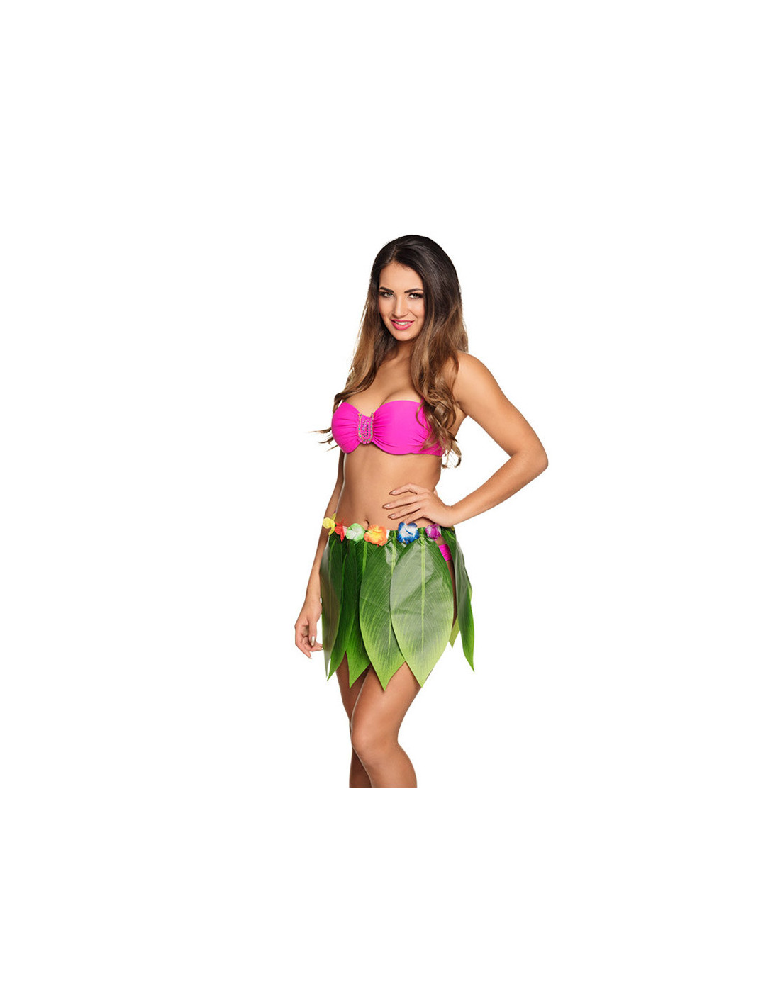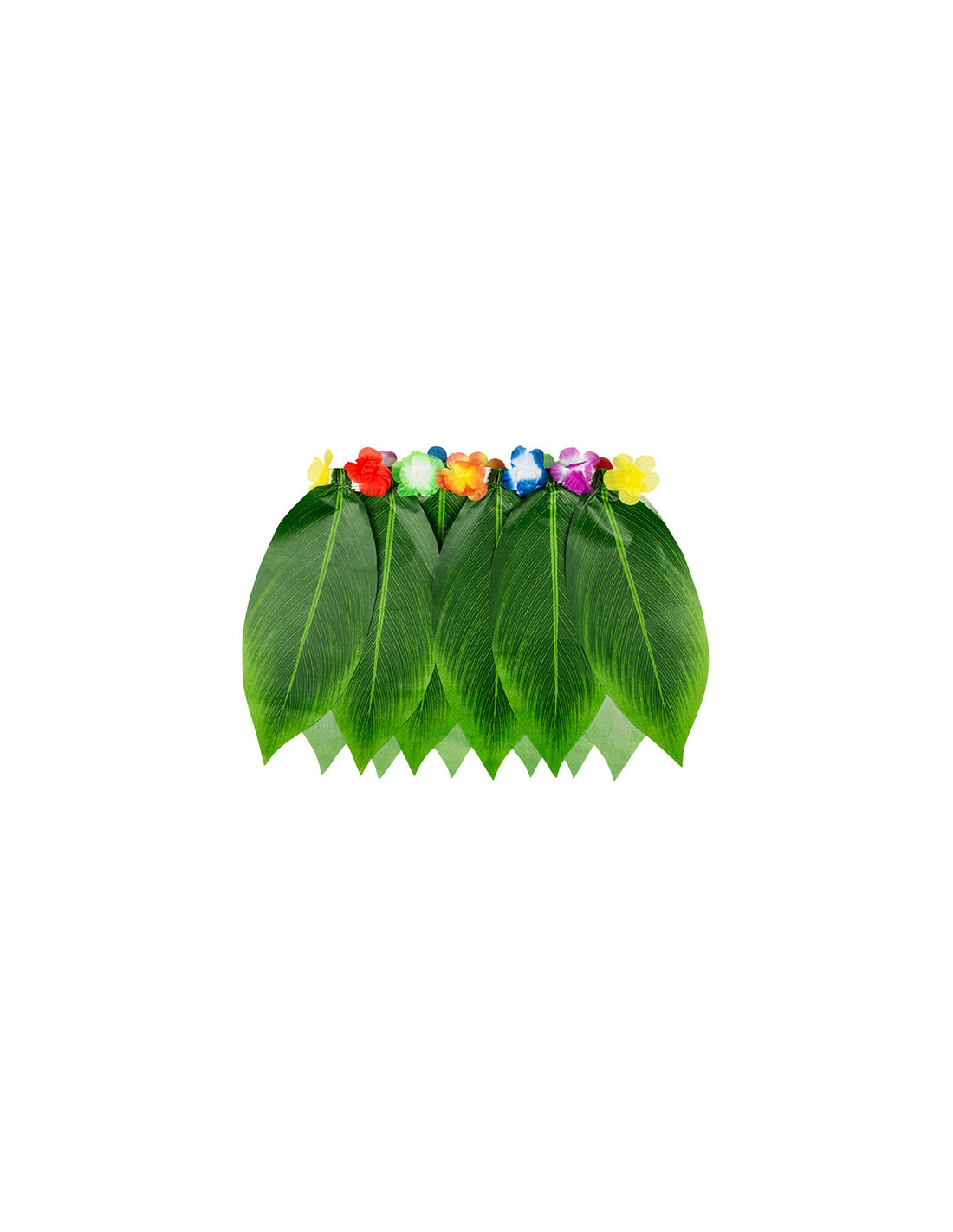 Falda hawaiana de hojas que mide unos 38cm de largo aproximadamente y cintura con goma elástica.