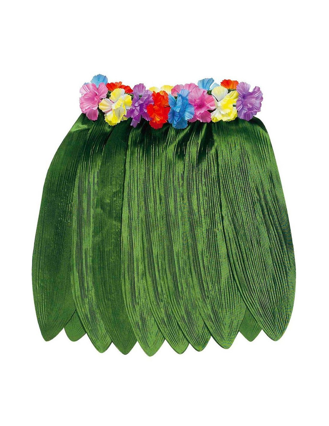 Incluye falda hawaiana verde con flores en la parte superior. Fabricada de tela.