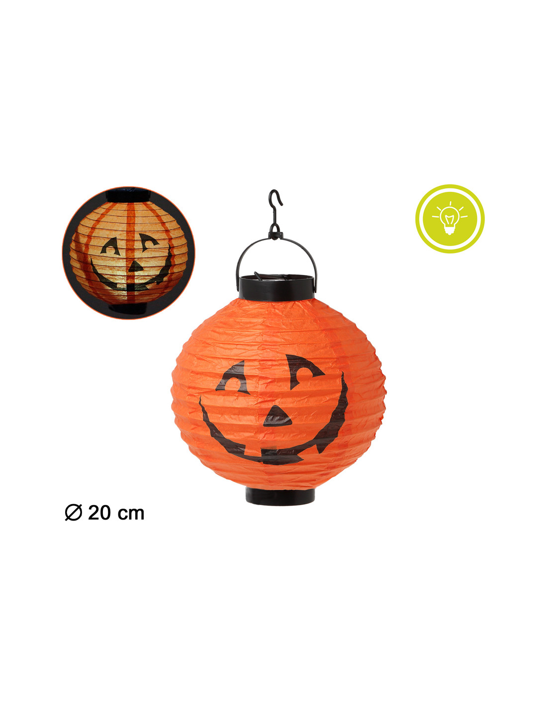Farolillo calabaza Halloween con luz que mide 20cm de diámetro.