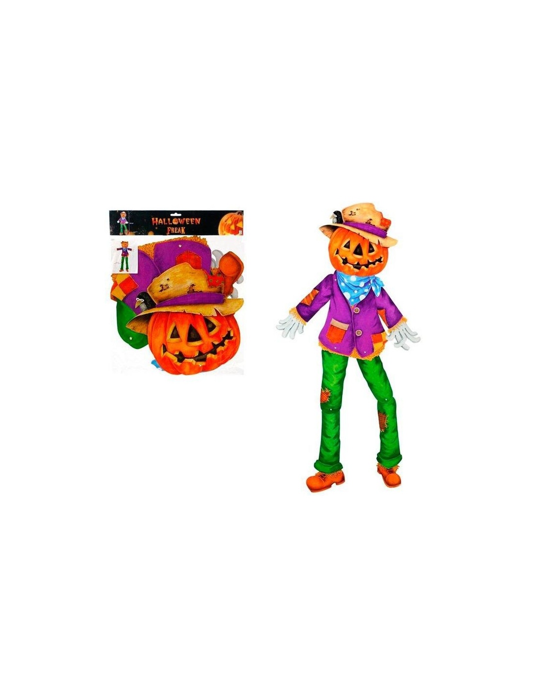 Figura de espantapájaros articulada en tonos verdes,morados y naranjas para decorar tu fiesta de Halloween. Dimensiones de 125cm de altura. Fabricada de cartón.