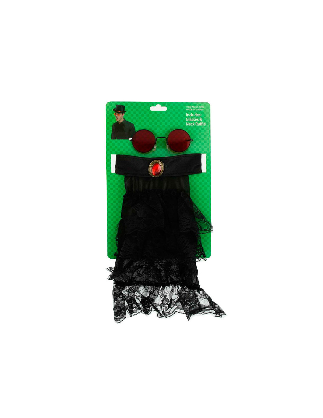 Gafa y chorrera de Vampiro compuesto por unas gafas con cristal rojo y una chorrera negra para el cuello con piedra.