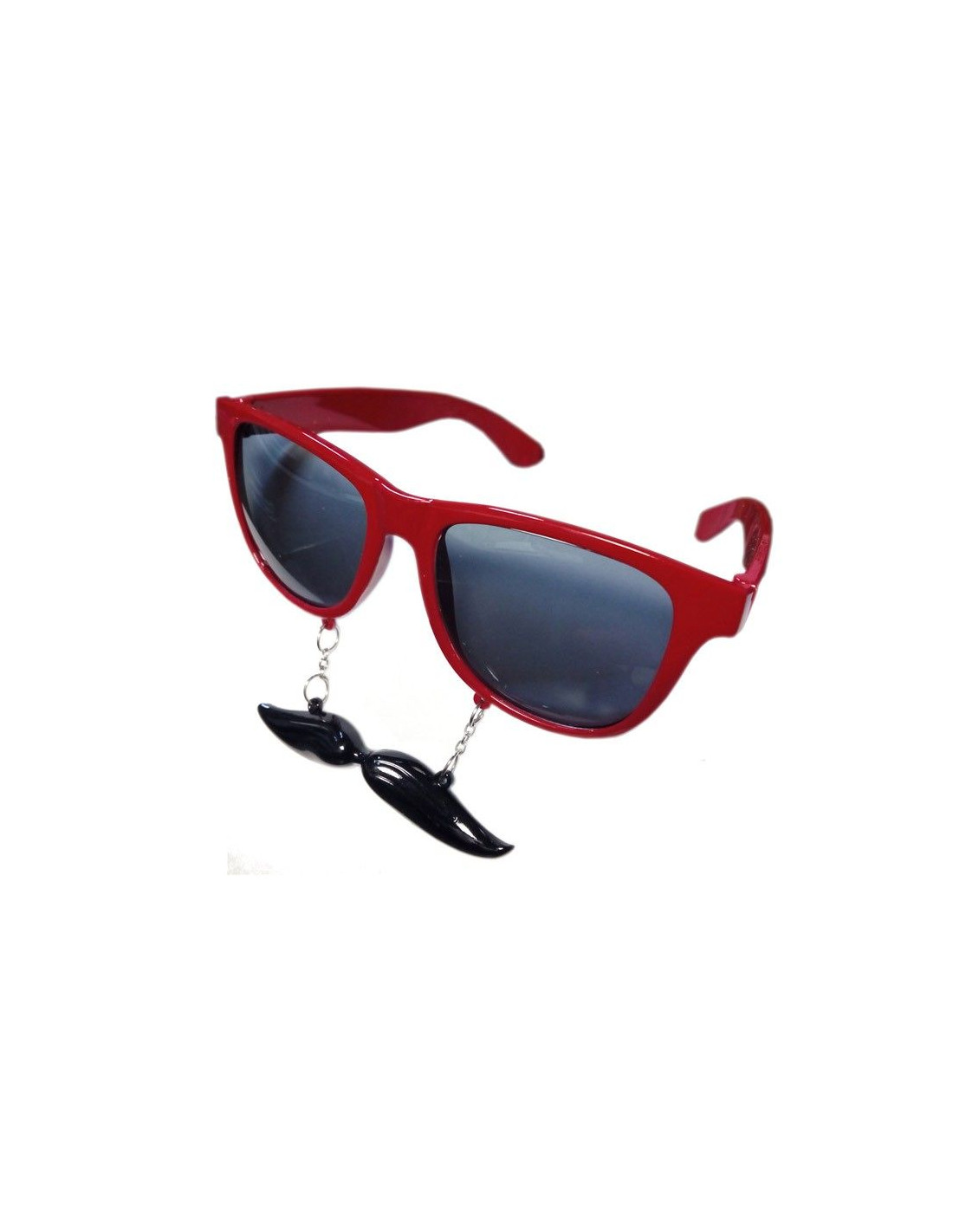 Divertidas gafas con bigote para fiestas y eventos. Estas gafas tienen unas medidas de 15cm de anchura en color rojo, con un bigote de plástico colgando de la parte baja, mediante cadena.