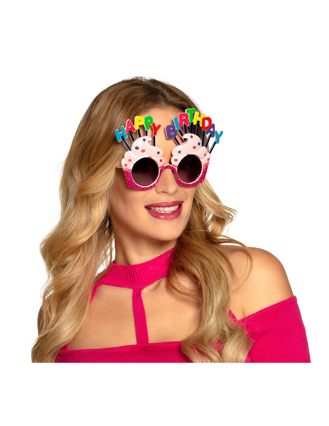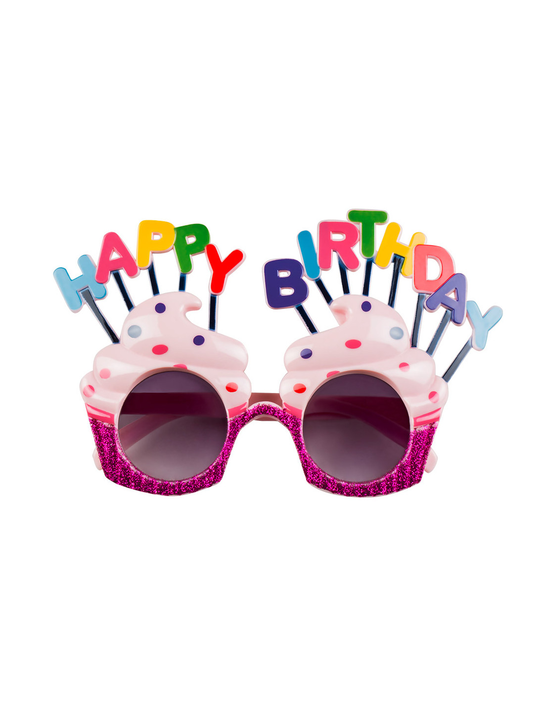 Gafas de cumpleaños de plástico con forma de cupcakes y velas con las palabras 'Happy Birthday'.