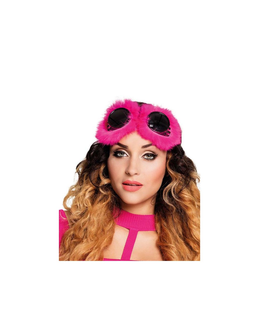Estas gafas fantasía para mujer son de plástico en color negro y pelo sintético color rosa alrededor. Se sujeta a la cabeza con una goma elástica.