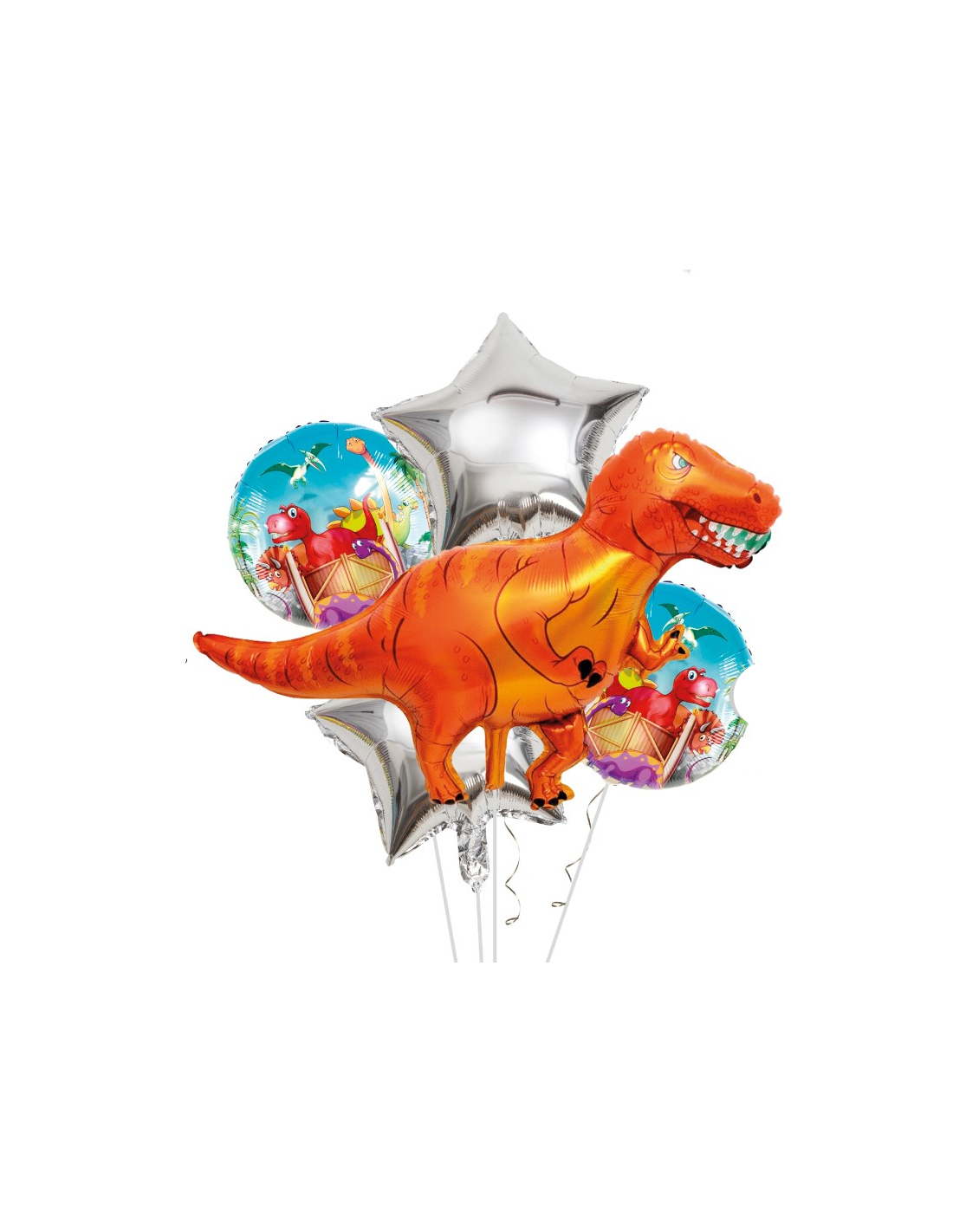 Set globos dinosaurio que incluye un globo con forma de dinosaurio de 100cm, dos globos con forma de estrella de 45cm y dos globos redondos de 45cm.