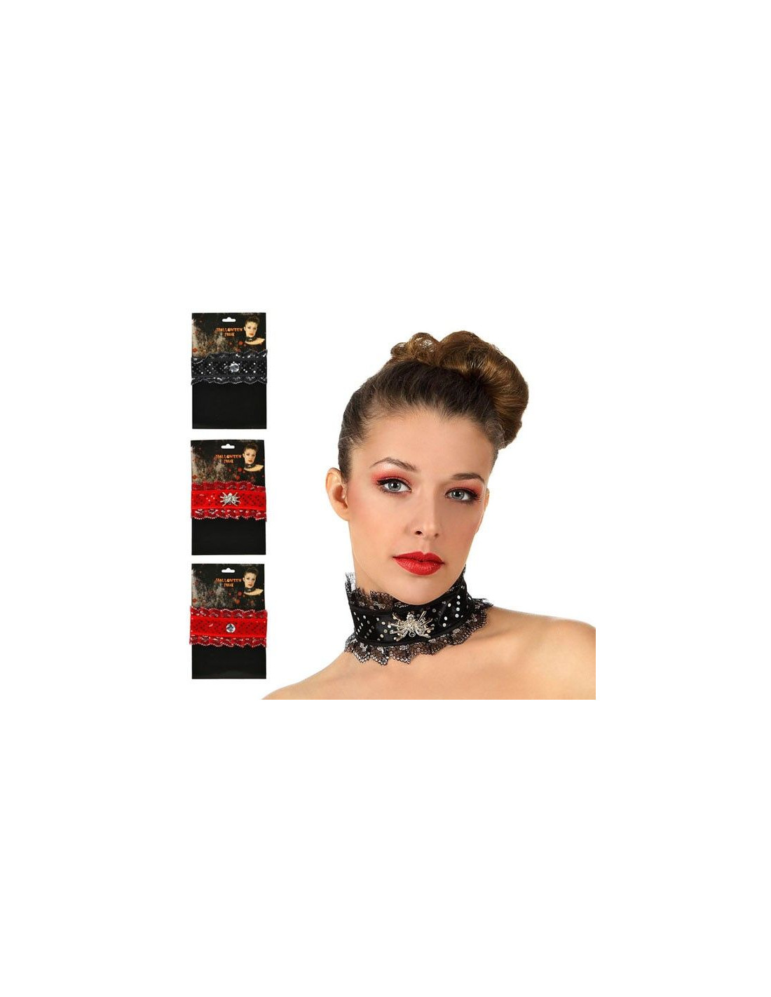 Gargantilla de Halloween para tu disfraz de vampiresa en cuatro modelos surtidos con cinta negra o roja, decorados con puntilla del mismo color y adornos en plata. Se ata con velcro por la parte trasera.