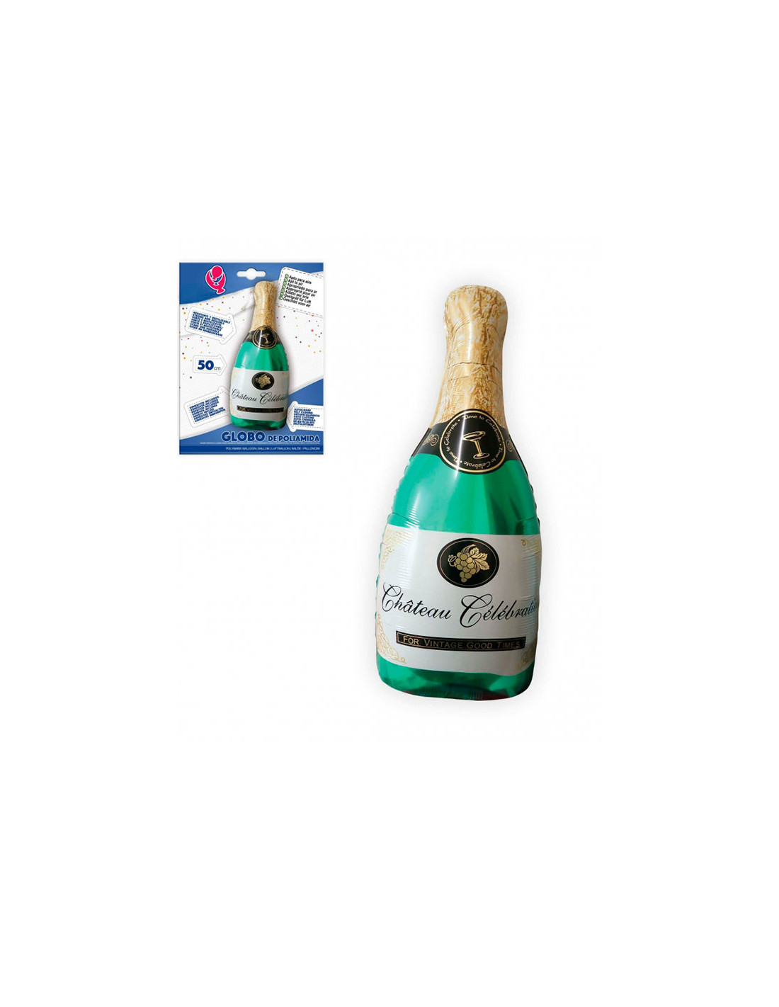 Globo botella de cava gigante de poliamida que mide 50cm de alto. No es apto para usar con helio.