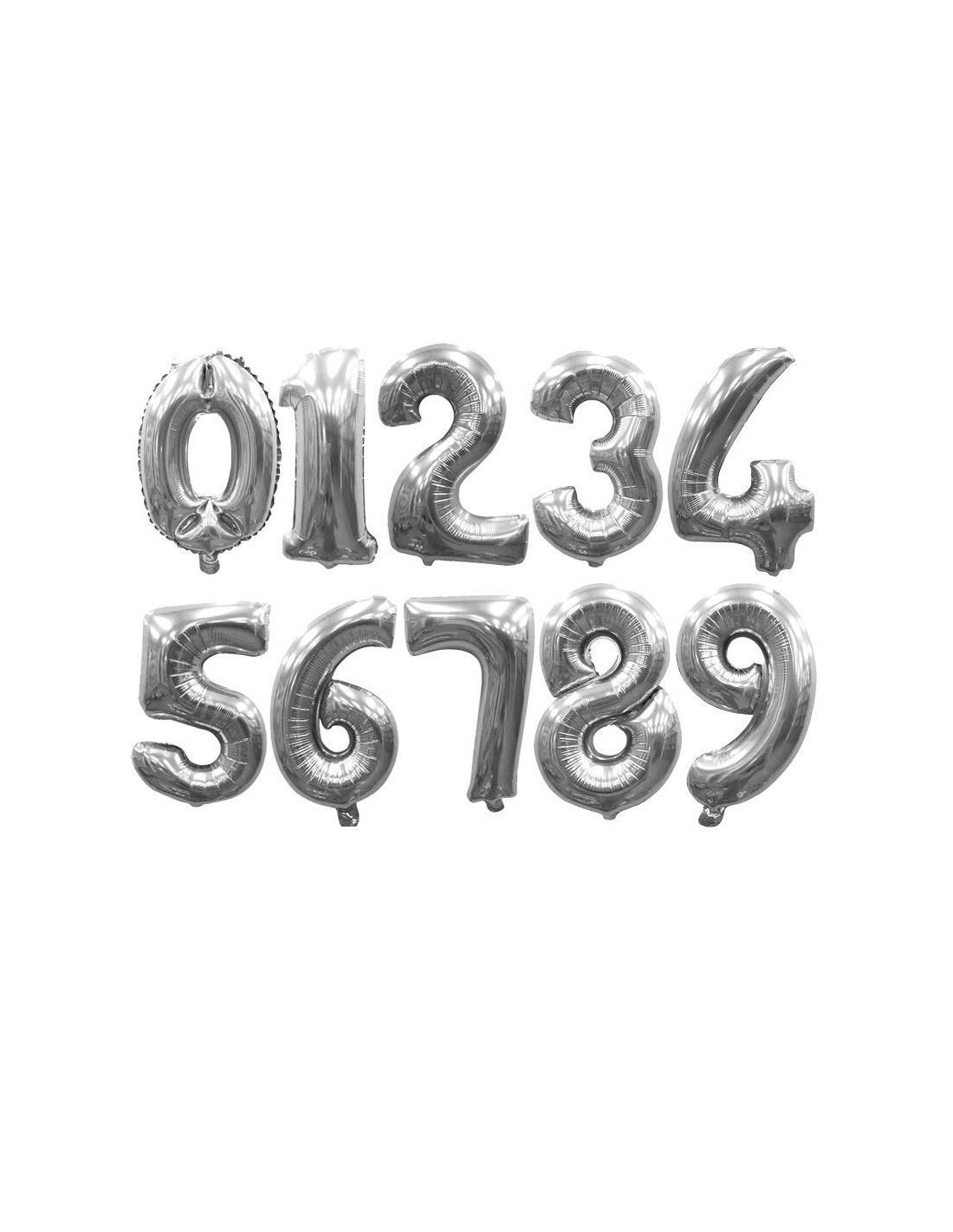 Estos globos con forma de número son metalizados en color plata y tienen una altura de 86cm. Los globos se venden por unidad, selecciona el número que deseas y añade al carrito.