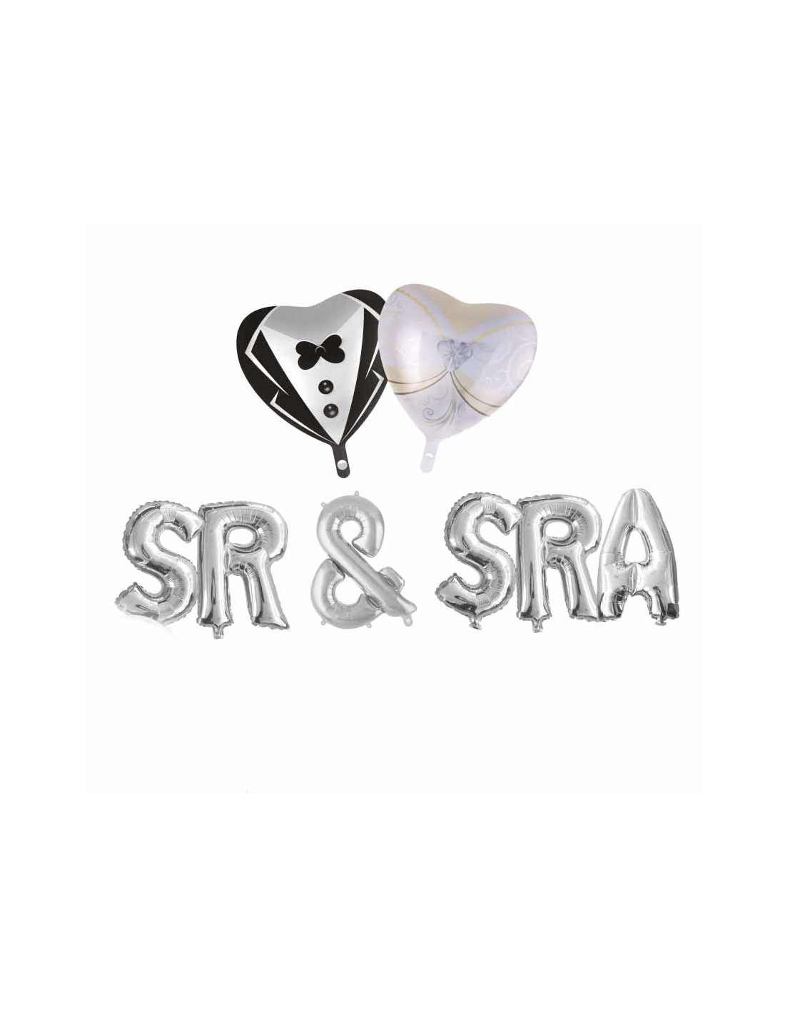 Este pack de globos contiene 2 globos con forma de corazón de 45cm estampados, y 6 letras plateadas que miden 40cm formando el texto 'SR & SRA'.