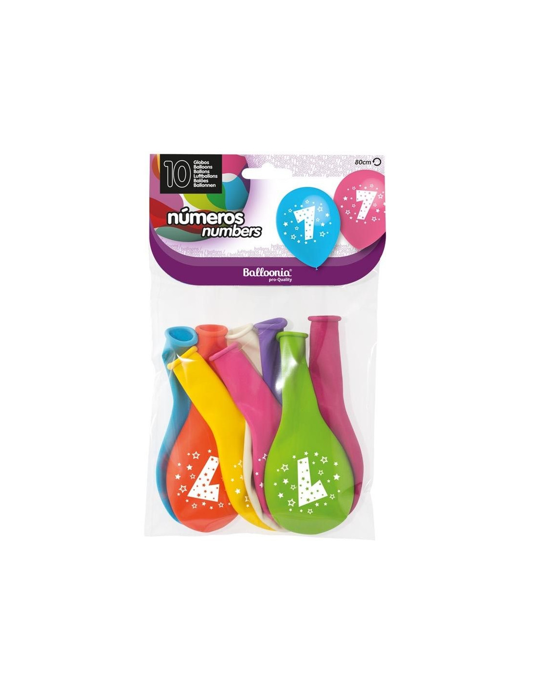 Globos de números para decoracón de fiestas de cumpleaños, infantiles o aniversario. Bolsas con 10 globos en su interior, estampados con números del 0 al 9.