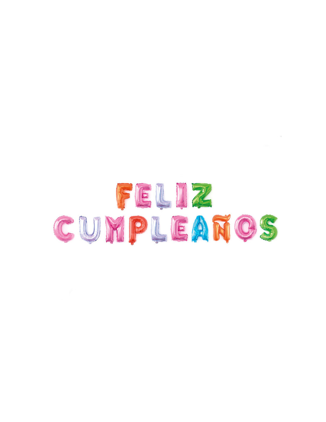 Contiene 15 coloridos globos de efecto metalizado con las letras de la palabra 'Feliz Cumpleaños'. cada letras mide 40cm de alto aproximadamente.