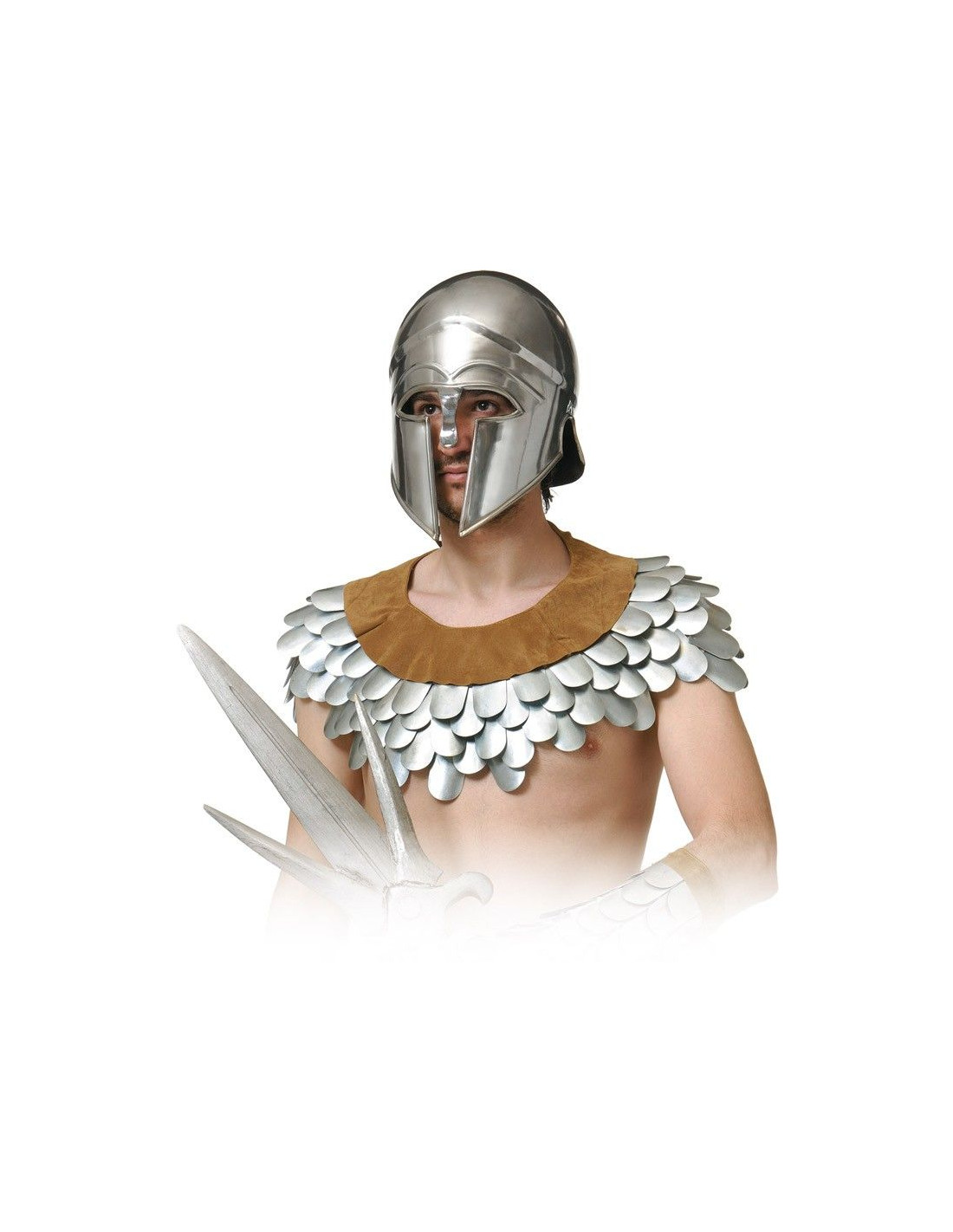 Gorjal medieval de alta calidad para lucir con tu traje de guerrero en cualquier feria de la Edad Media. Con la base del cubre hombros fabricada en antelina recia de color marrón, cuenta con chapas de hierro de formas redondas en los extremos.