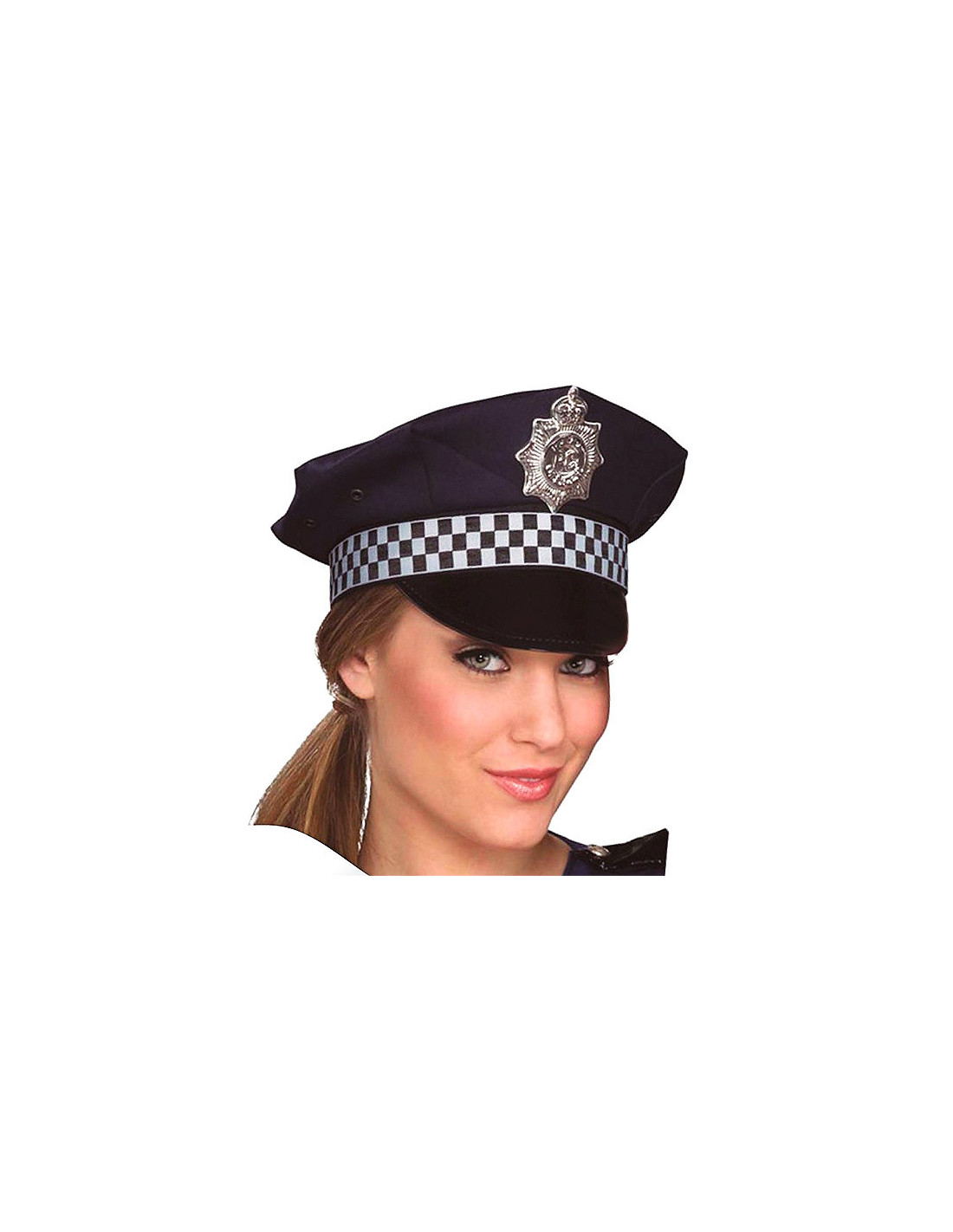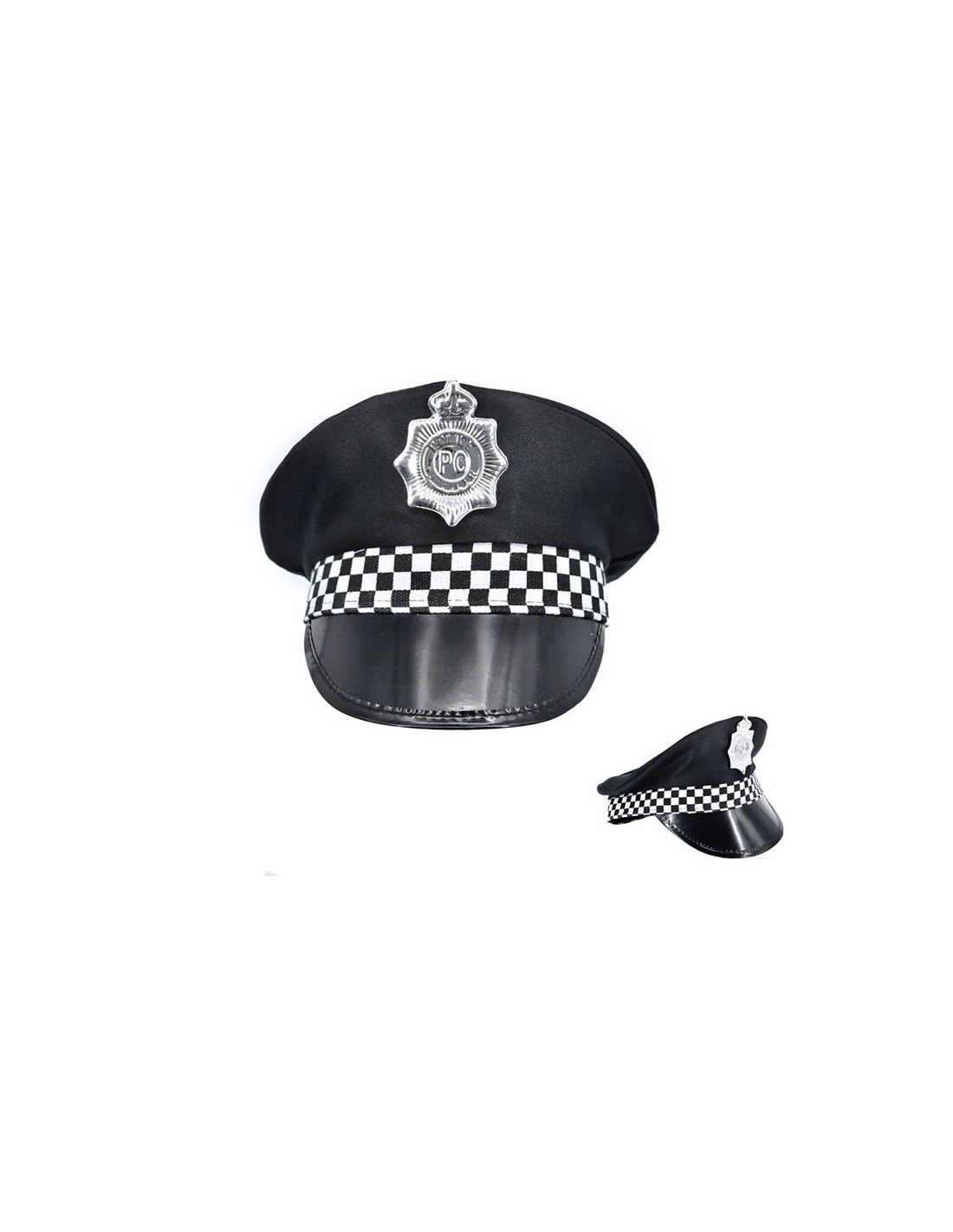Contiene una gorra de policía urbanco con visera, estampado en la clásica franja de cuadros blancos y negros y una insignia de policía. Tiene un contorno de 56cm aproximadamente.