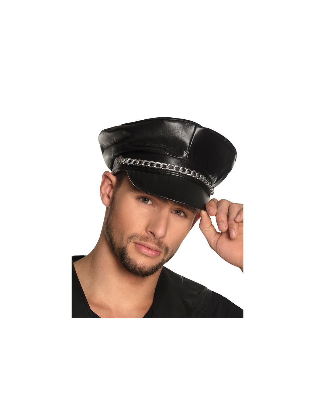 Gorra con visera de polipiel y con una cadena en la delantera para tu disfraz de motero.