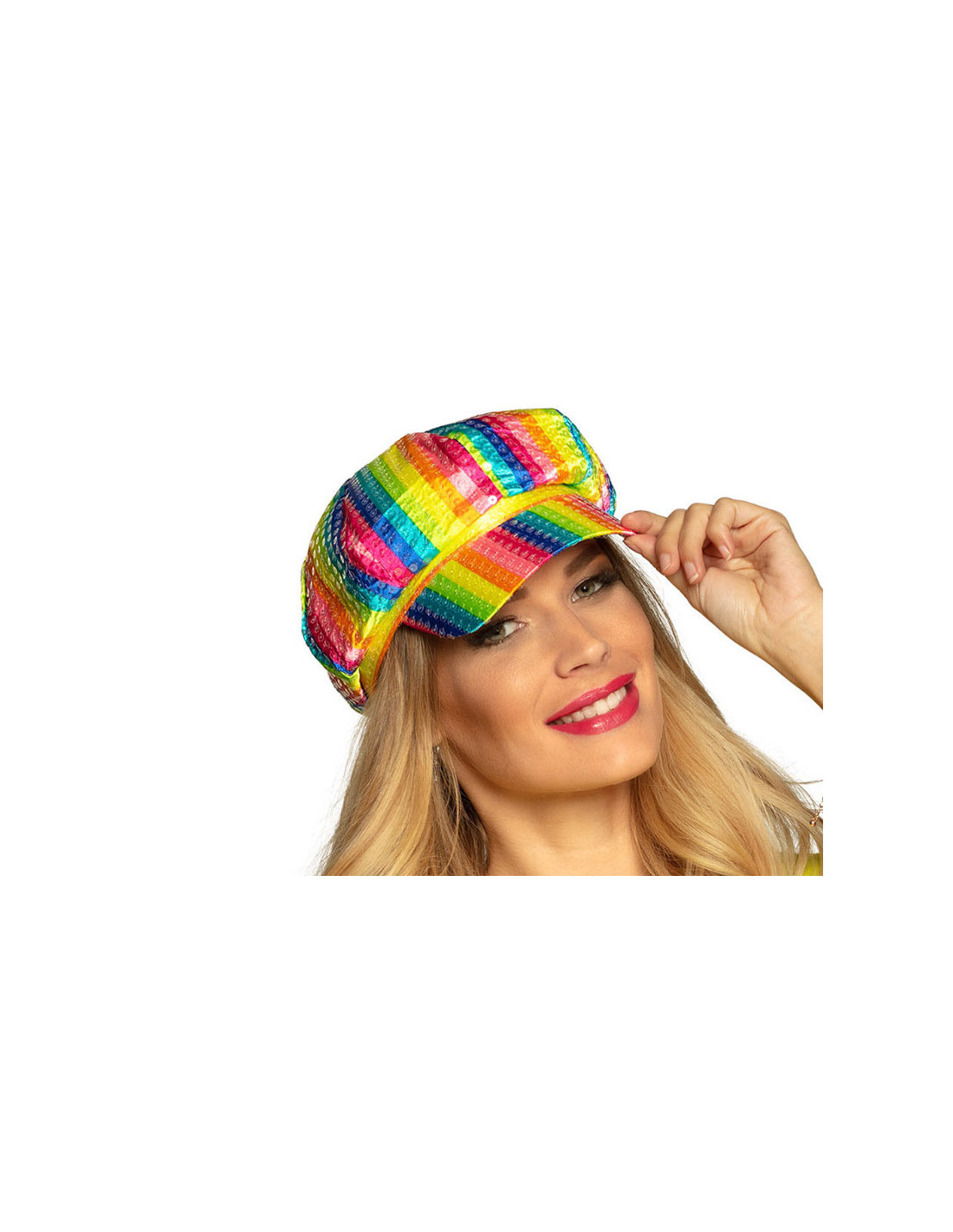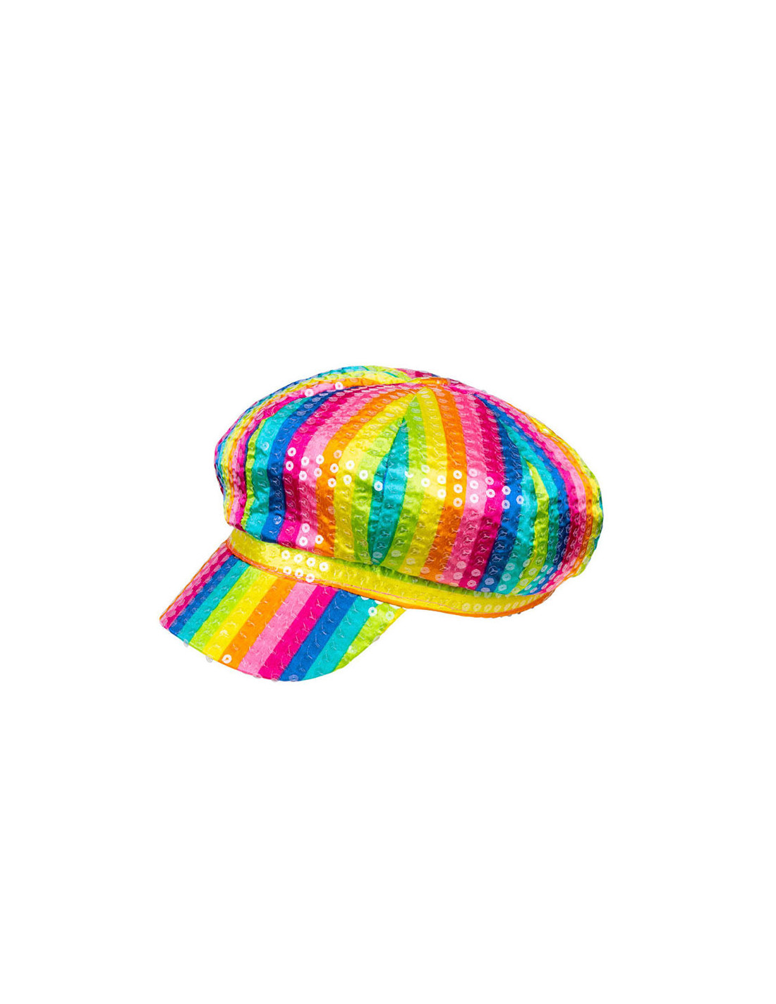 Gorra multicolor lentejuelas que incluye una gorra con visera con los colores del arcoíris y lentejuelas transparentes.