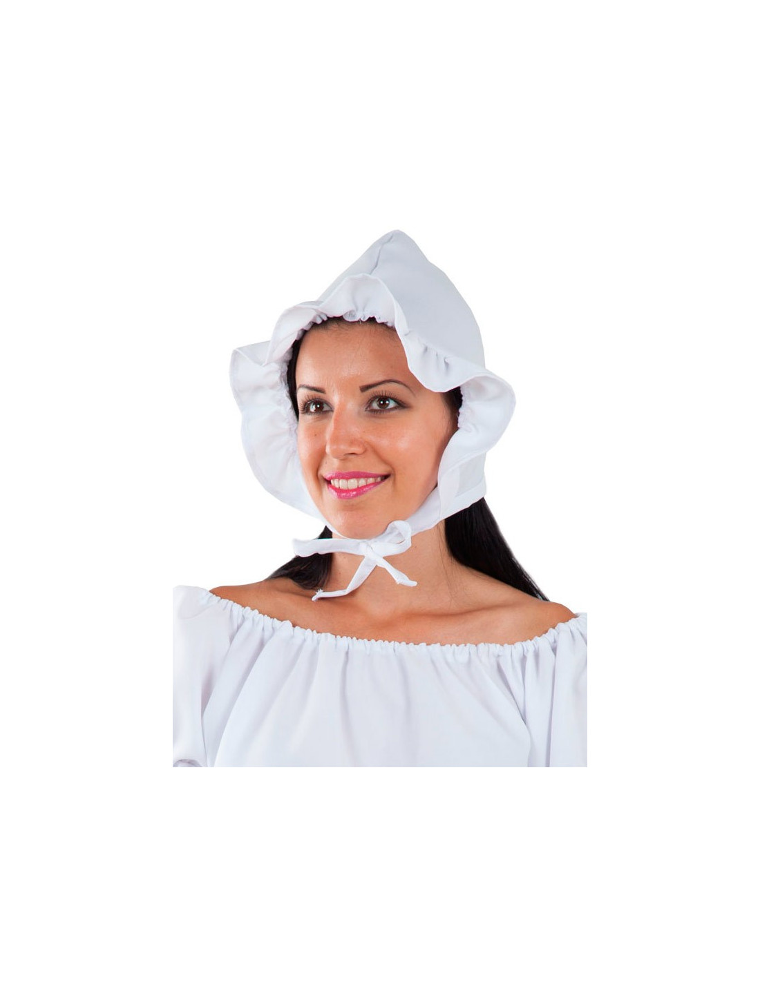 Gorro medieval de campesina , estilo cofia, fabricado de tela en color blanco. Tiene unos volantes en el contorno de la parte frontal y cuenta con dos tiras en la parte inferior para ajustarlo perfectamente debajo de la barbilla.