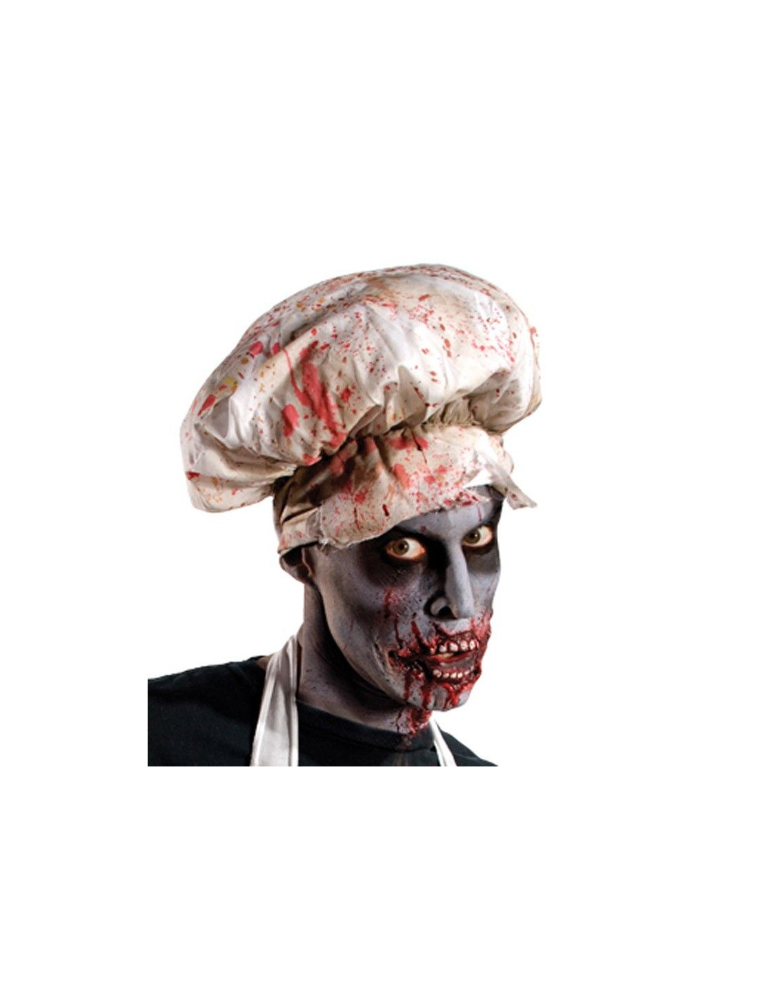 Gorro de cocinero zombie con manchas rojas simulando sangre.
