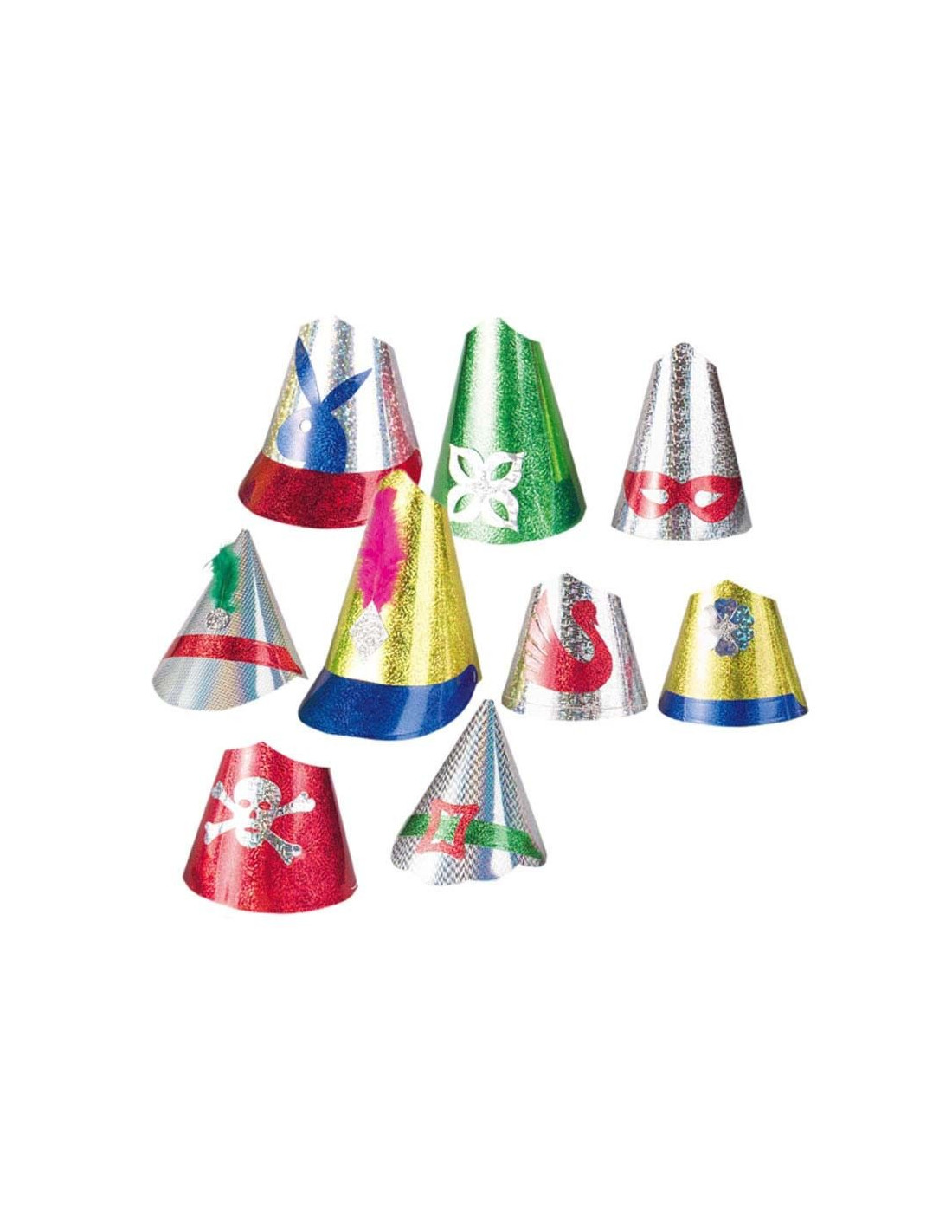Fabricado de cartón y con unas dimensiones de 30x20 cm cada uno, este gorro de fiesta es ideal para darle un toque divertido a cualquier evento. Se venden en colores surtidos y con diversos estampados.
