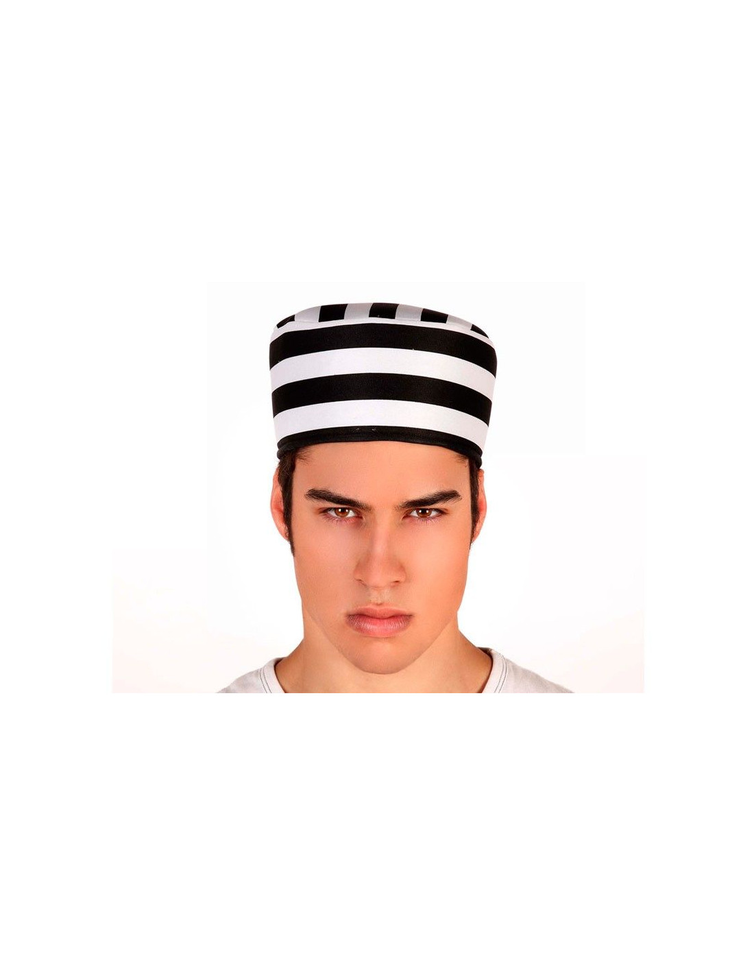 Gorro de presidiario clásico en color blanco con rayas negras. Ideal para complementar tu disfraz de preso.