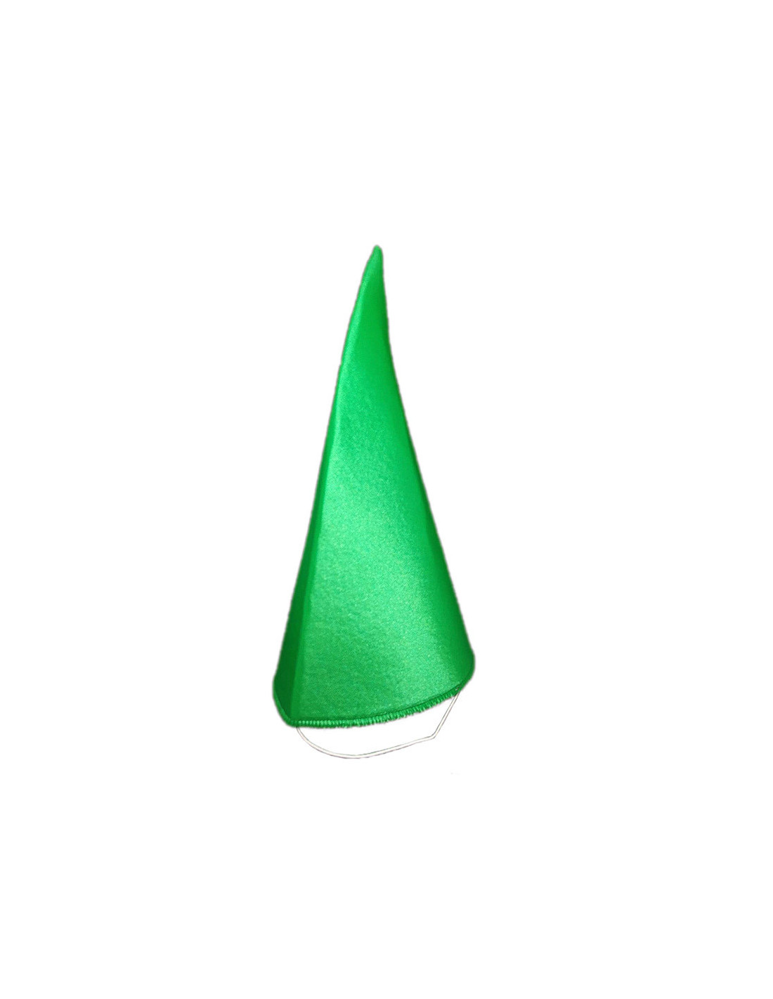 Este sombrero enano está confeccionado de foam verde de 30cm de altura y 48cm aprox de contorno. Este tipo de gorros se lleva apoyado encima de la cabeza. Tiene una goma elástica para sujetarlo.