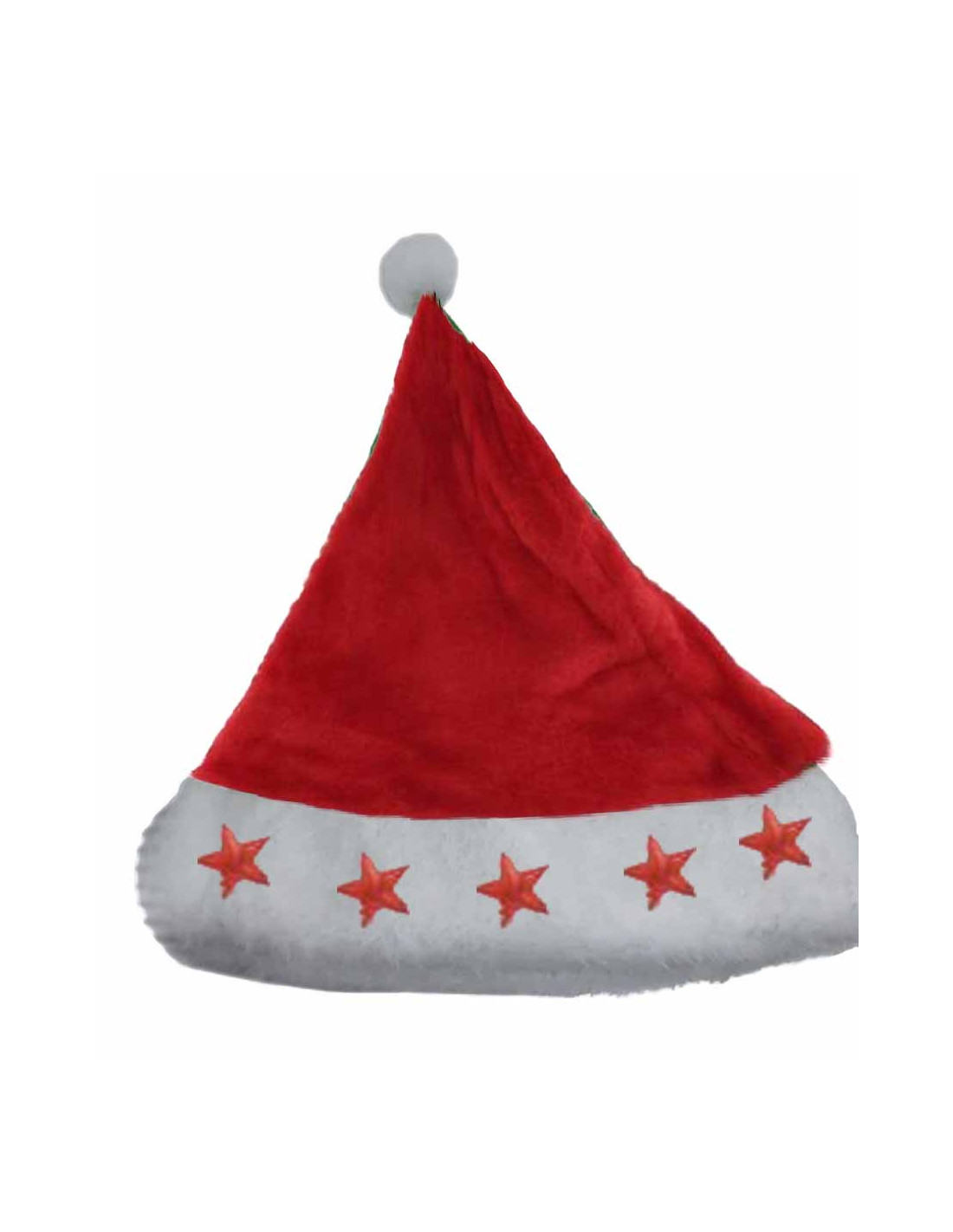 Gorro de Papa Noel confeccionado en tejido de pelo cortito decorado con estrellas que se iluminan gracias a dos pilas LR41. Contorno 57cm aprox.