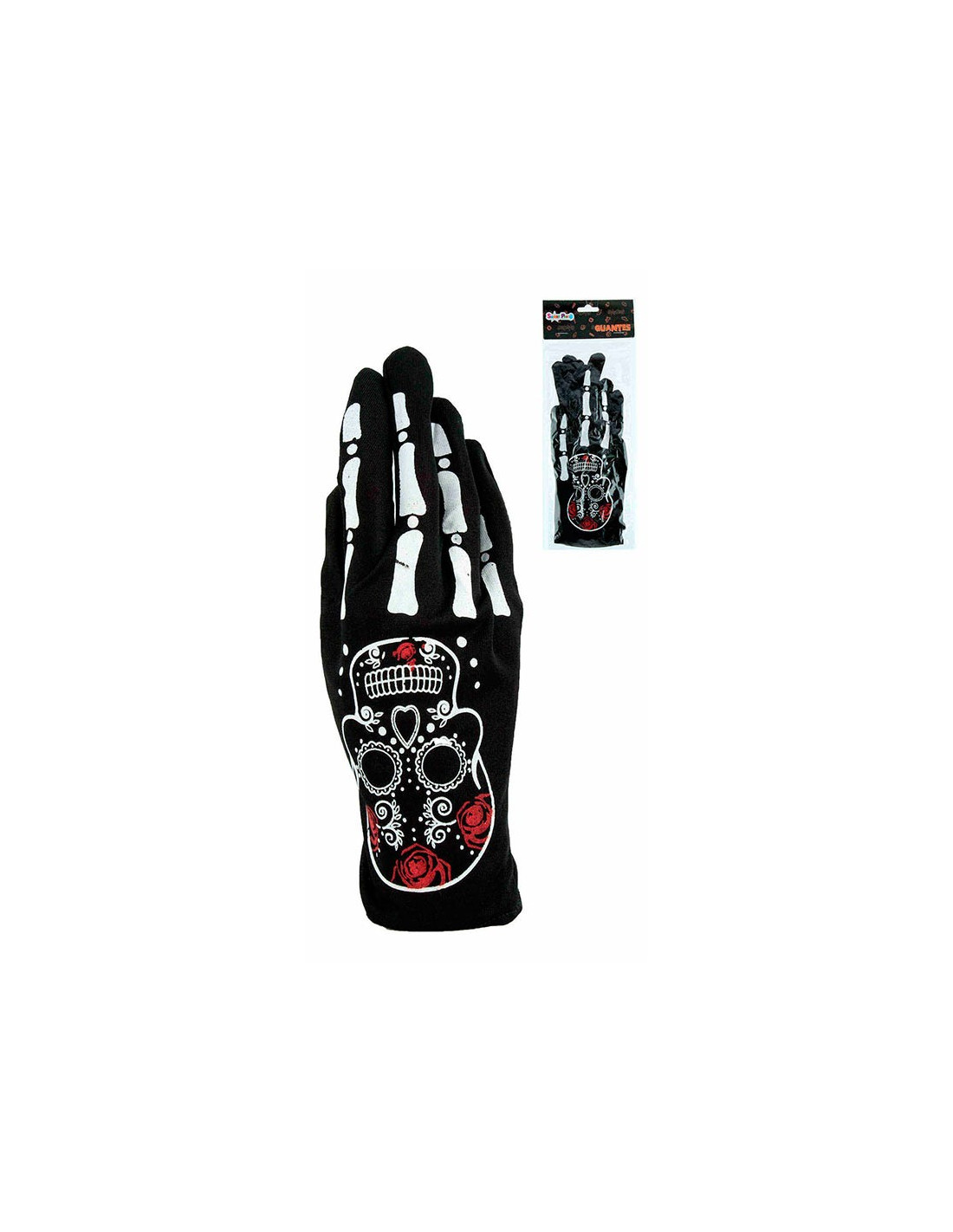 Estos guantes son perfectos para completar tu disfraz de calavera mejicana tanto para chico como chica. Son de color negro y tienen estampados una calavera y los huesos de los dedos.