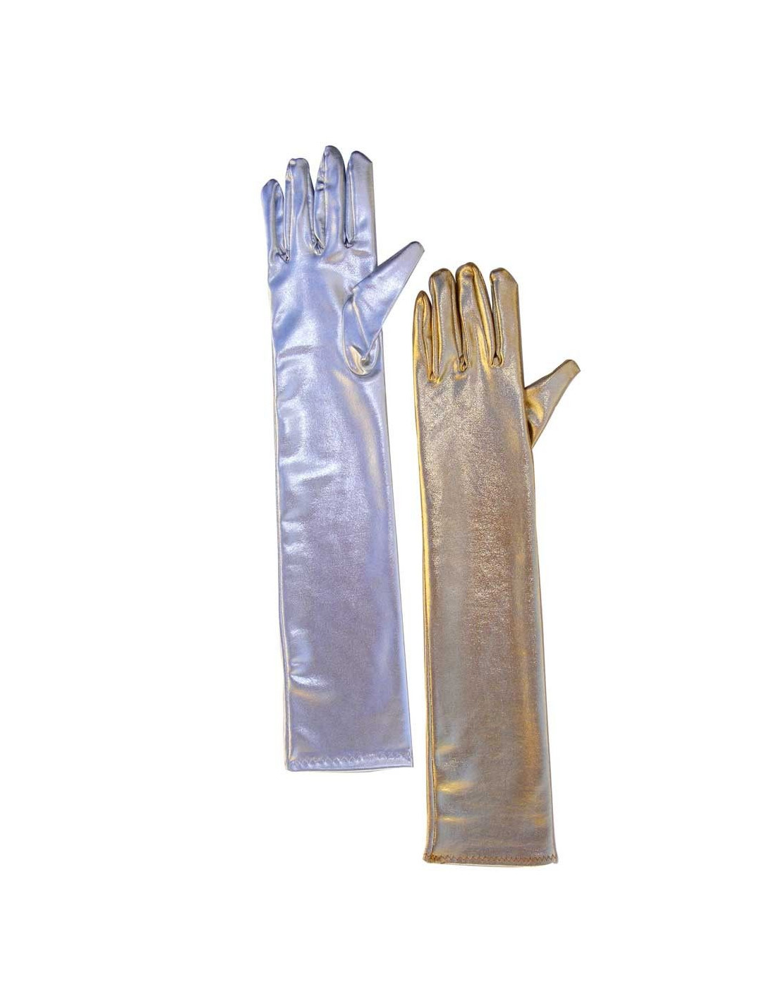 Guantes metalizados largos para complementar tu disfraz de charlestón o tu traje de nochevieja. Incluye un par de guantes metalizados largos, fabricados en tejido metalizado brillante para que deslumbres en tus noches más especiales, de dimensiones de 45cm de largura y disponibles en color dorado y plata.