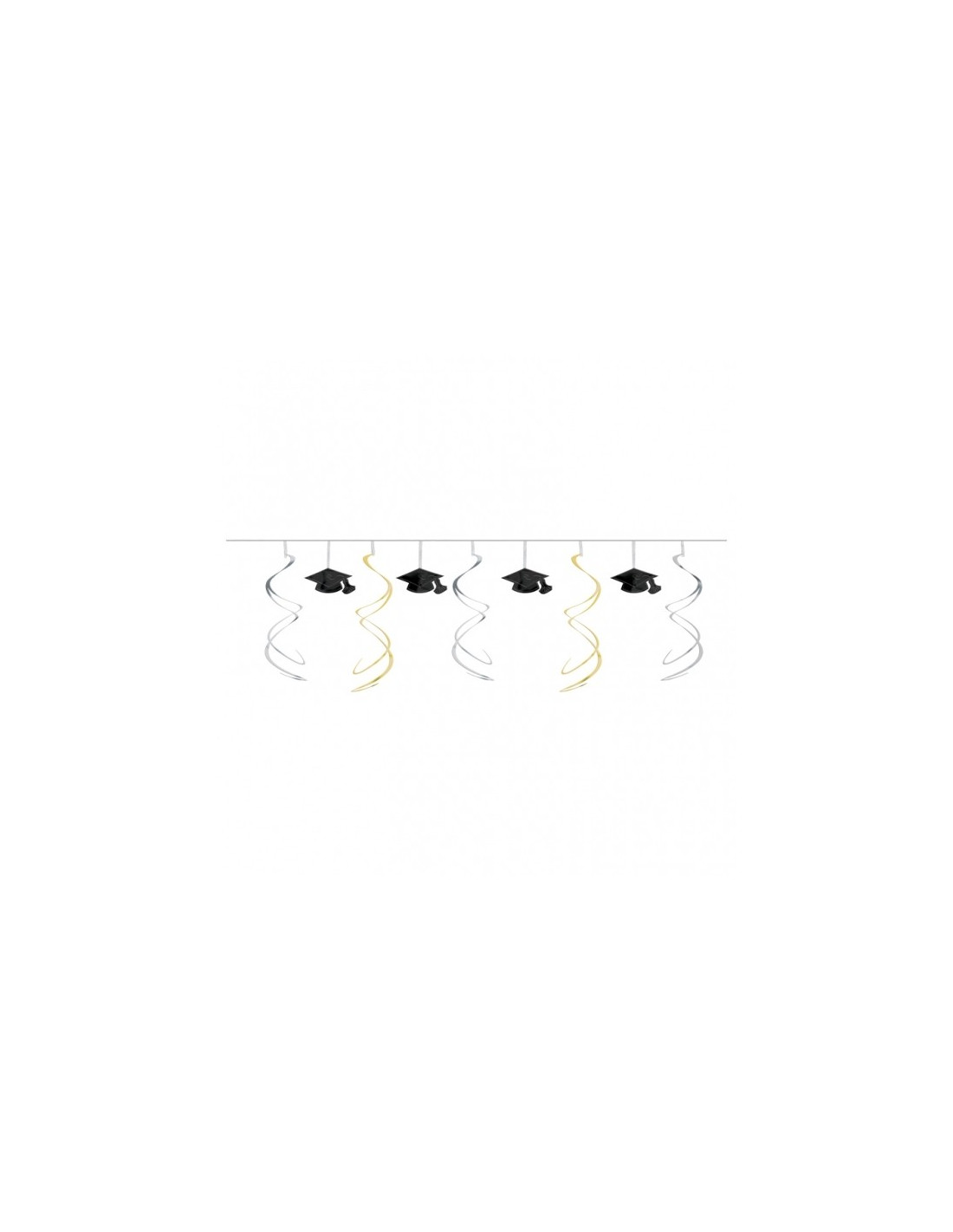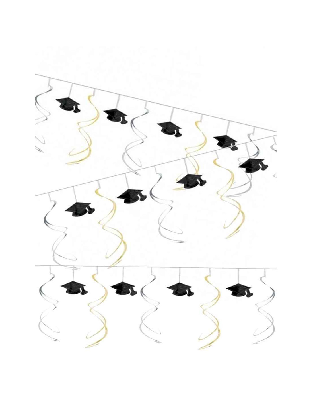 Consta de una guirnalda con birretes negros colgantes y espirales en color oro y plata de forma intercalada. Mide 3,6 metros de largo.