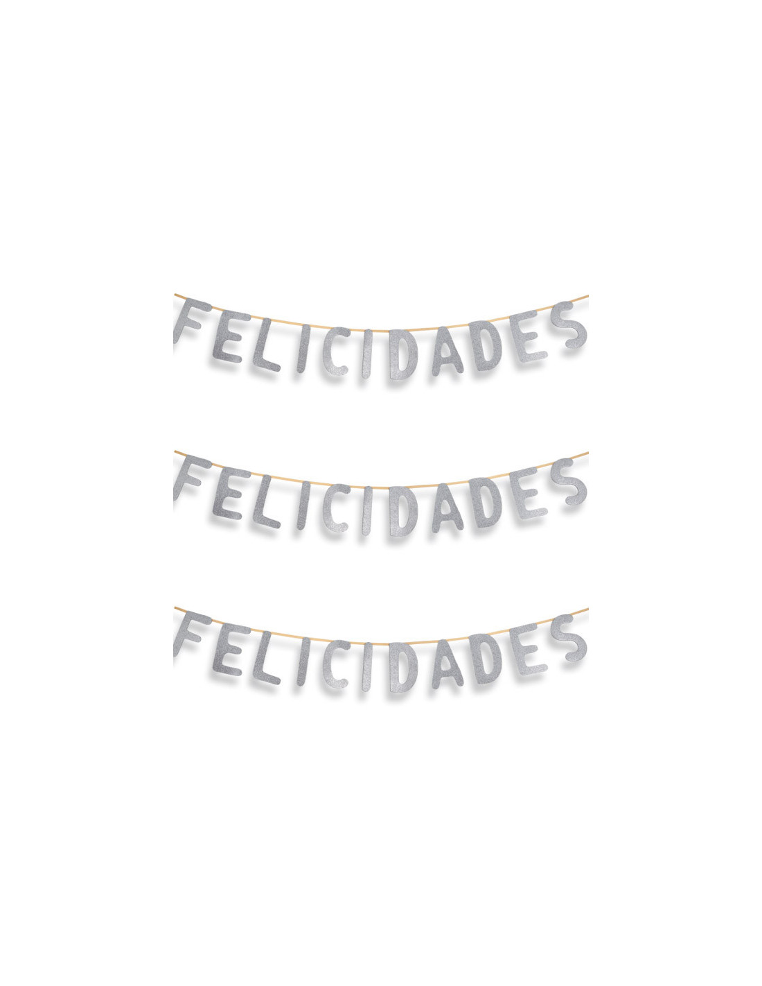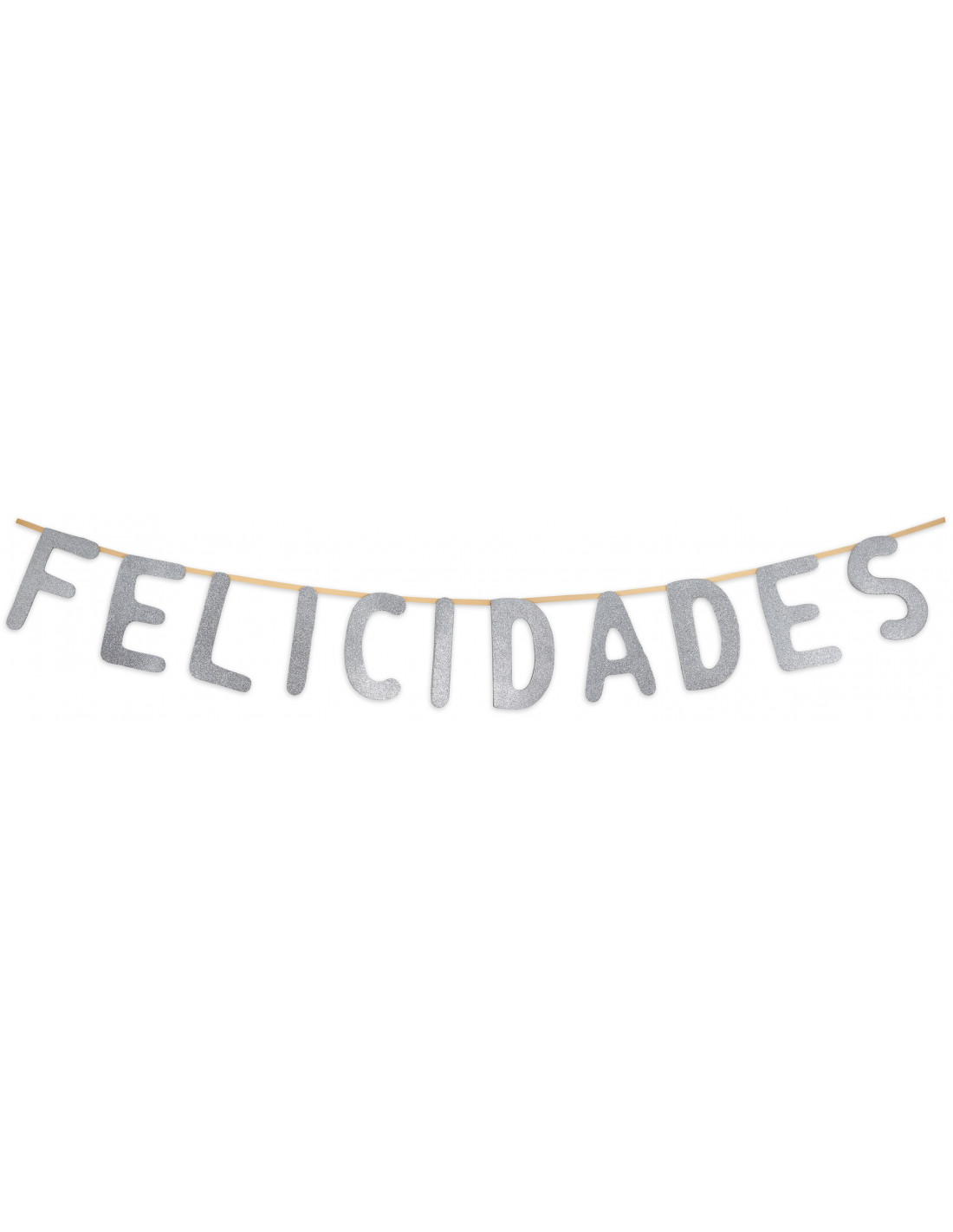 Guirnalda Felicidades de goma eva glitter que incluye una guirnalda de 1,30m de largo con el mensaje "Felicidades". Cada letra tiene un tamaño aproximado de 16x10cm. Disponible en color oro o plata.