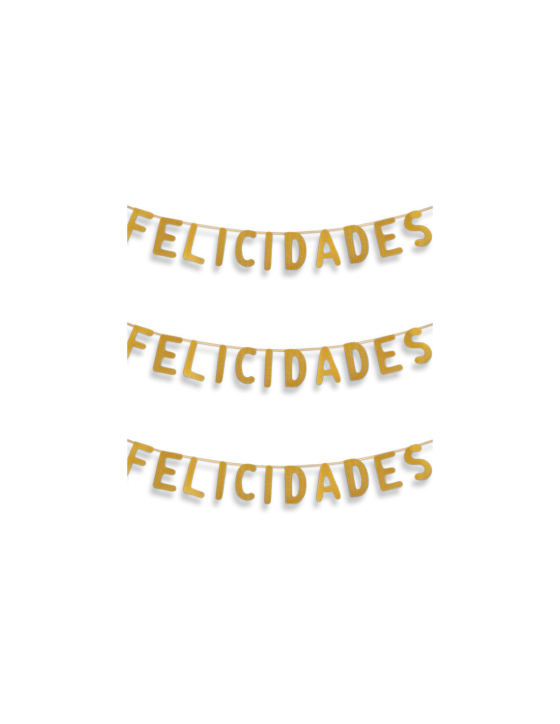 Guirnalda Felicidades de goma eva con purpurina que incluye una guirnalda con el mensaje "Felicidades" en mayúsculas y de 1,30m de largo. Cada letra tiene un tamaño aproximado de 16x10cm. Esta guirnalda está disponible en color oro y plata.