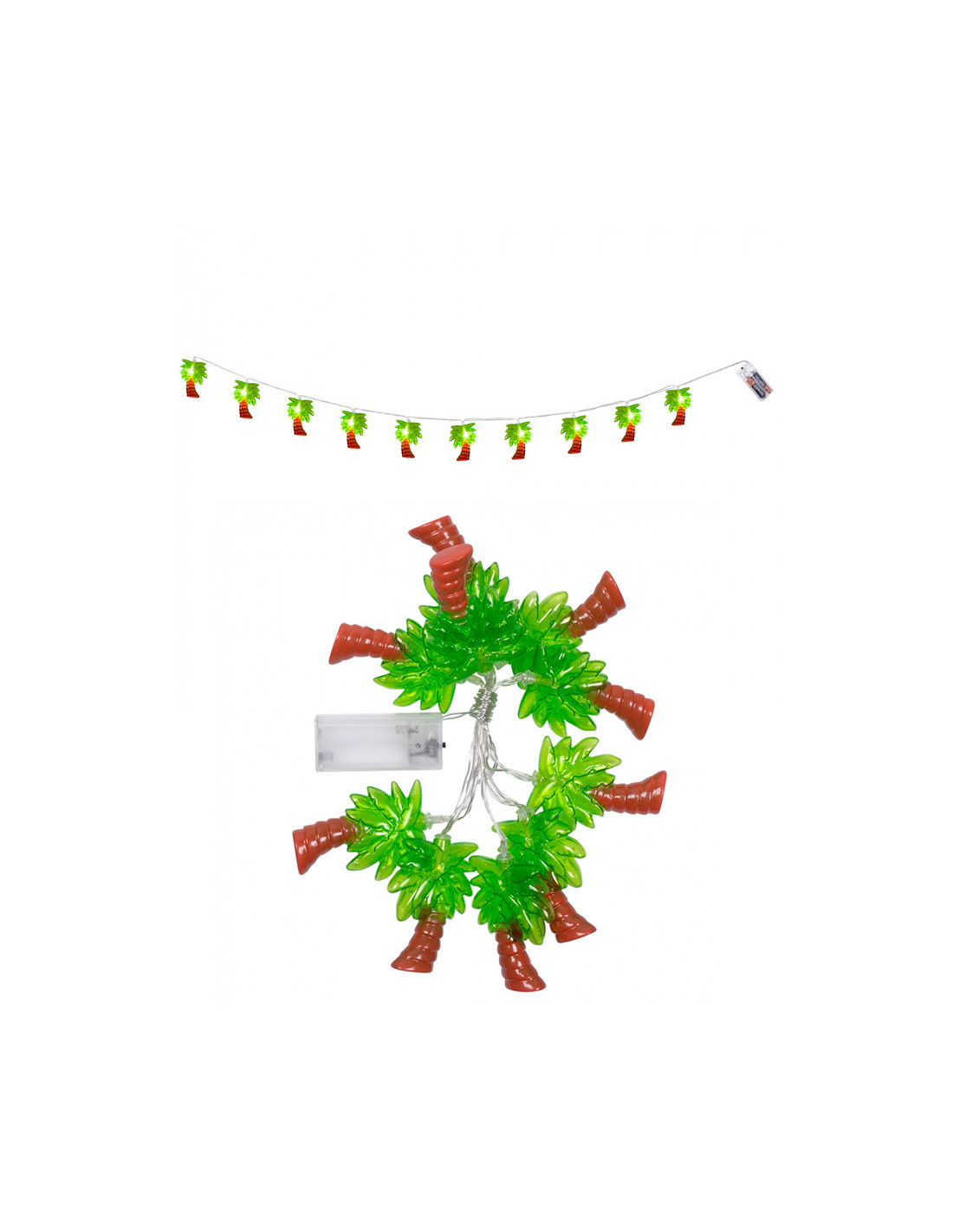 La guirnalda palmeras con luz que mide 140cm de largo y consta de 10 palmeritas de 8x6cm. Funciona con pilas 2AA que no van incluidas.