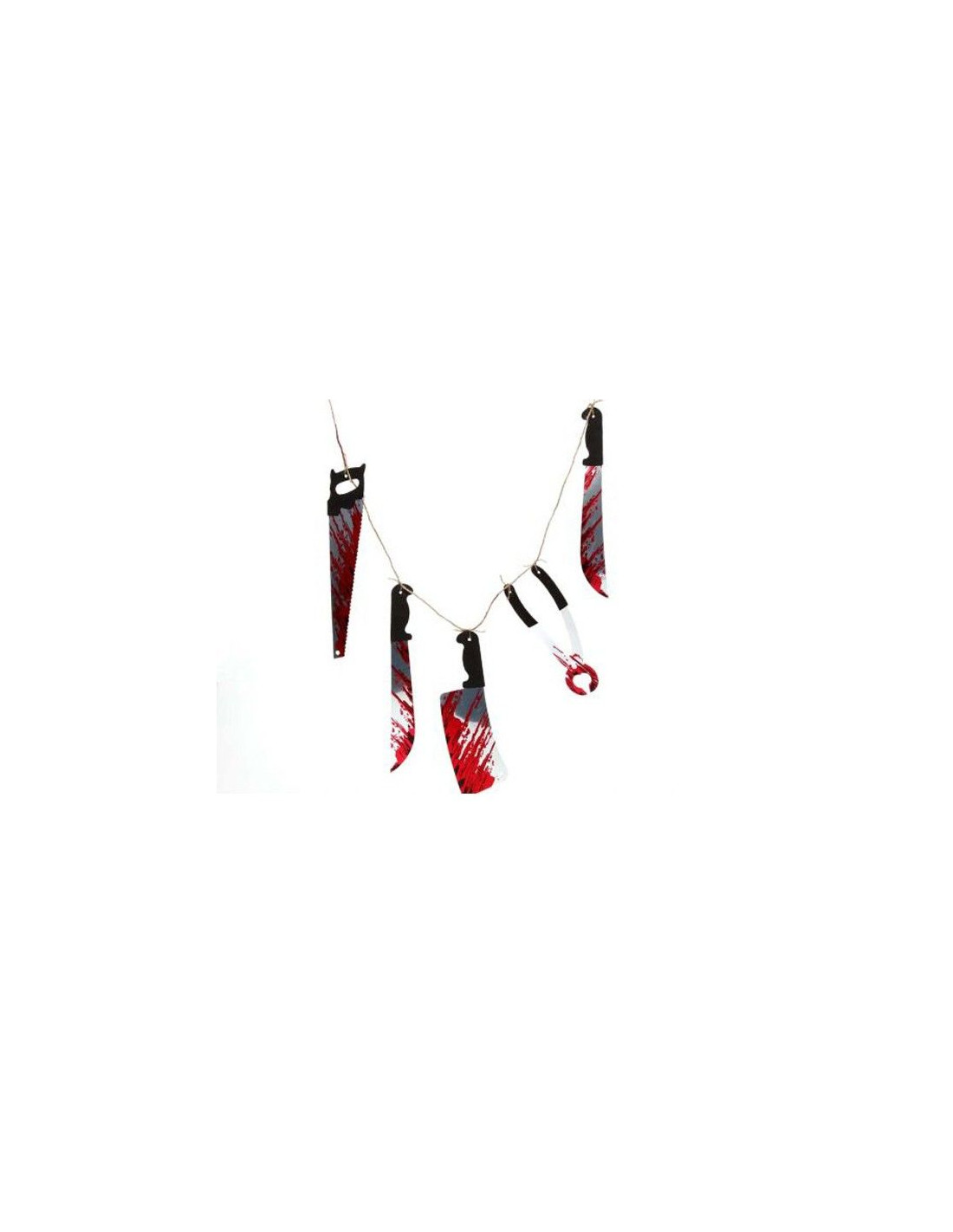 Guirnalda carnicero para halloween compuesta por cuchillos y otros utensilios de tortura. Los cuchillos y demas estan fabricados, la oja en plastico con manchas de sangre y el mango de goma eva. Las medidas de los cuchillos son de 36x10cm aprox. de pendiendo el cuchillo. La guirnalda tiene una longitud total de 180cm de larga.