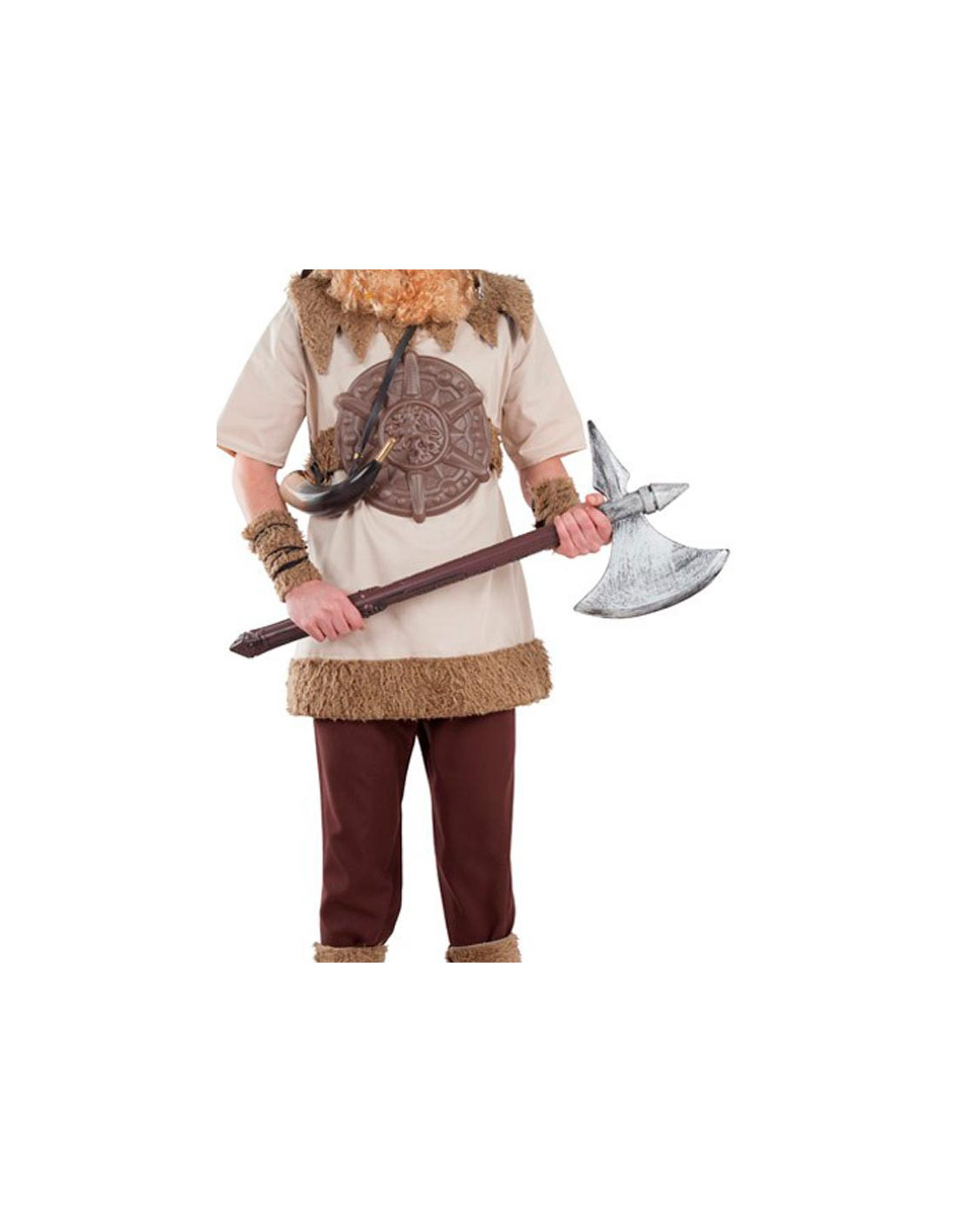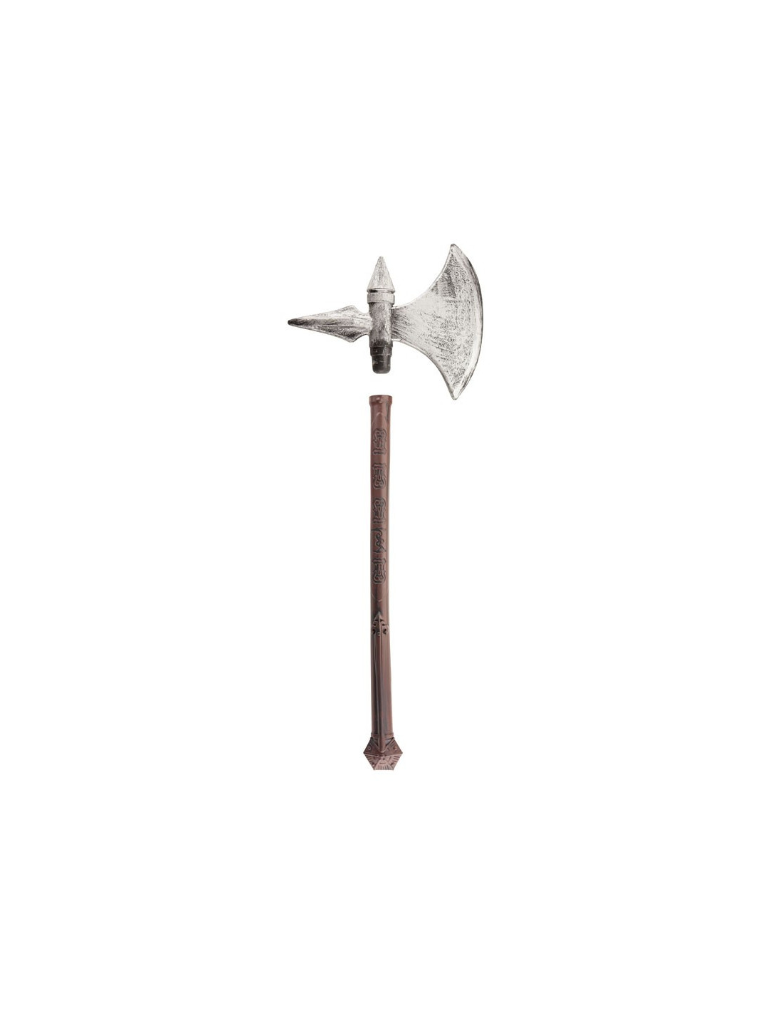 Hacha de guerra desmontable para librar las mejores batallas medievales. Fabricada de plástico, cuenta con un mango en color marrón con diferentes motivos ornamentales grabados en el mismo y una cabeza plateada. Es desmontable, pues se puede separar el mango de la cabeza.  Dimensiones de 83 cm de longitud (67 cm de mango y 16 cm de cabeza).