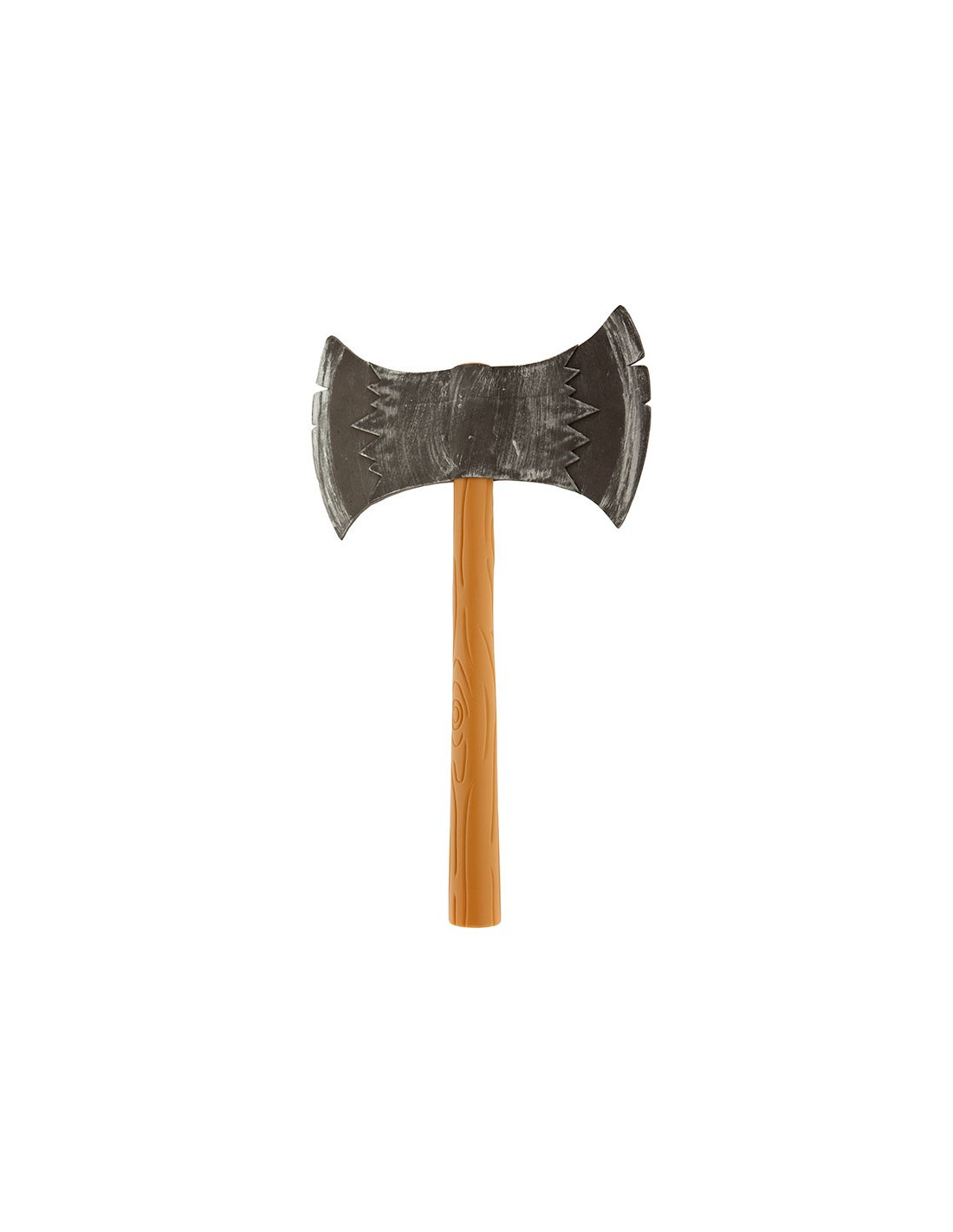 Este hacha doble corta mide 50x33cm. Tiene un mango de plástico y la hoja es de goma eva.